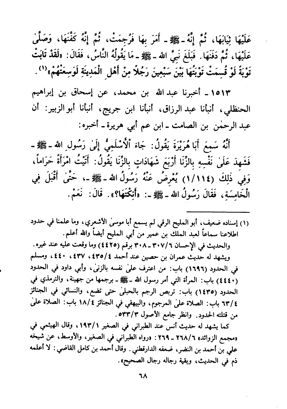 1513 - أخبرنا عبد الله بن محمد، عن إسحاق بن إبراهيم الحنظلي، أنبأنا عبد الرزاق، أنبأنا ابن جريج، أنبأنا أبو الزبير: أن عبد الرحمن بن الصامت- ابن عم أبي هريرة- أخبره: أَنَّهُ سَمعَ أَبَا هُرَيْرَةَ يَقُولُ: جَاءَ اْلأسْلَمِيُّ إِلَى رَسُولِ الله -صلى الله عليه وسلم- فَشَهِدَ عَلَى نَفْسِهِ بِالزِّنَا أَرْبَعَ شَهَادَاتٍ بِالزِّنَا يَقُولُ: أَتَيْتُ امْرَأَةً حَرَاماً، وَفِي ذلِكَ (114/ 1) يُعْرِضُ عَنْهُ رَسُولُ الله -صلى الله عليه وسلم-، حَتَّى أَقْبَلَ فِي الْخَامِسَةِ، فَقَالَ رَسُولُ الله -صلى الله عليه وسلم-:" أَنِكْتَهَا؟ ". قَالَ: نَعَمْ.