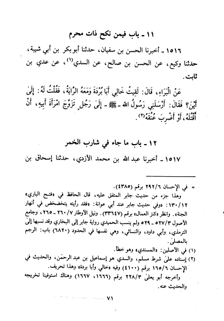 1516 - أخبرنا الحسن بن سفيان، حدثنا أبو بكر بن أبي شيبة، حدثنا وكيع، عن الحسن بن صالح، عن السدي (¬1)، عن عدي بن ثابت. عَنْ الْبَرَاءِ، قَالَ: لَقِيتُ خَالِي أَبَا بُرْدَةَ وَمَعَهُ الرَّايَةُ، فَقُلْتُ لَهُ: إِلَى أَيْنَ؟ فَقَالَ: أَرْسَلَنِيْ رَسُولُ الله -صلى الله عليه وسلم- إِلَى رَجُلٍ تَزَوَّجَ امْرَأَةَ أَبِيهِ، أَنْ أقْتُلَهُ، أَوْ أَضْرِبَ عُنُقَهُ (¬2).