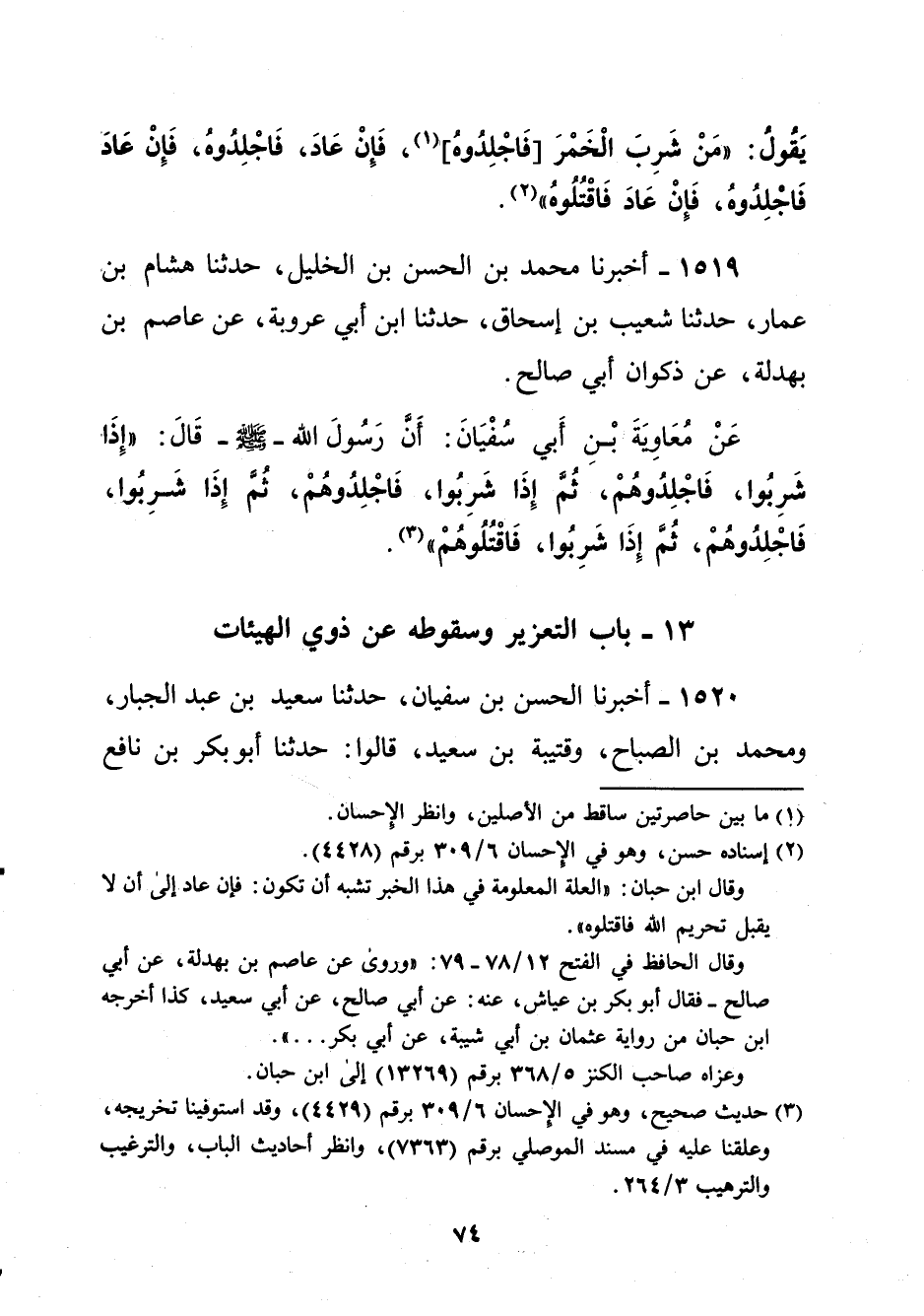 1519 - أخبرنا محمد بن الحسن بن الخليل، حدثنا هشام بنا عمار، حدثنا شعيب بن إسحاق، حدثنا ابن أبي عروبة، عن عاصم بن بهدلة، عن ذكوان أبي صالح. عَنْ مُعَاوِيةَ بْنِ أَبي سُفْيَانَ: أَنَّ رسول الله -صلى الله عليه وسلم- قَالَ: "إِذَا شَرِبُوا، فَاجْلِدُوهُمْ، ثُمُّ إِذَا شَرِبُوا، فَاجْلِدُوهُمْ، ثُمَّ إِذَا شَرِبُوا، فَاجْلِدُوهُمْ، ثُمَّ إِذَا شَرِبُوا، فَاقْتُلُوهُمْ" (¬3).