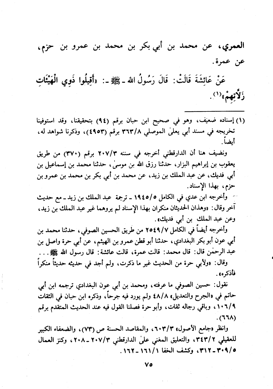 العمري، عن محمد بن أبي بكر بن محمد بن عمرو بن حزم، عن عمرة. عَنْ عَائِشَةَ قَالَتْ: قَالَ رَسُولُ الله -صلى الله عليه وسلم-: "أقيلوا ذَوِي الْهَيْئَاتِ زَلاَّتِهِمْ" (¬1).