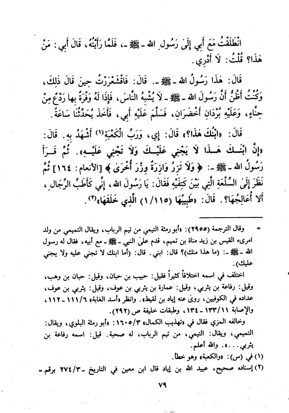 = وقال الترجمة (2955): "أبو رمثة التيمي من تيم الرباب، ويقال التميمي من ولد امرئ القيس بن زيد مناة بن تميم، قدم على النبي- صلى الله عليه وسلم- مع أبيه، فقال له رسول الله-صلى الله عليه وسلم-: (ما هذا منك)؟ قال: ابني. قال: (أما ابنك لا تجني عليه ولا يجني عليك).
