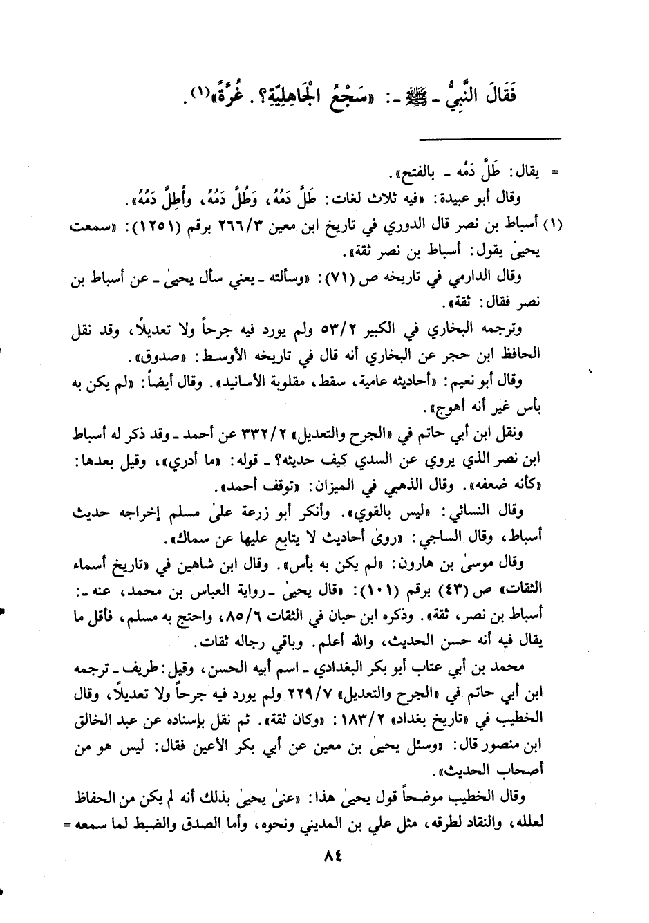 (¬1) أسباط بن نصر قال الدوري في تاريخ ابن، معين 3/ 266 برقم (1251):"سمعت يحيى يقول: أسباط بن نصر ثقة". وقال الدارمي في تاريخه ص (71): "وسألته -يعني سأل يحيى- عن أسباط بن نصر فقال: ثقة".