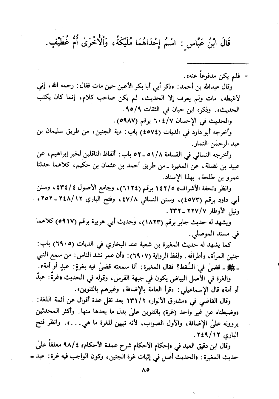 وقال القاضي في "مشارق الأنوار" 2/ 131 بعد نقل عدة أقوال عن أئمة اللغة: "وضبطناه عن غير واحد (غرة) بالتنوبن علي بدل ما بعدها منها. وأكثر المحدثين يروونه على الإضافة، والأول الصواب، لأنه تبيين للغرة ما هي ... ". وانظر فتح الباري 12/ 249. وقال ابن دقيق العيد في "إحكام الأحكام شرح عمدة الأحكام" 4/ 98 معلقاً على حديث المغيرة:" الحديث أصل في إثبات غرة الجنين، وكون الواجب فيه غرة: عبد =