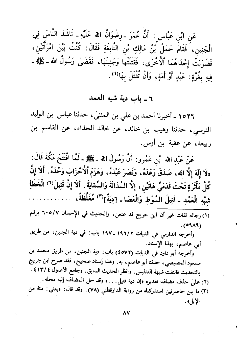 1526 - أخبرنا أحمد بن علي بن المثنى، حدثنا عباس بن الوليد النرسي، حدثنا وهيب بن خالد، عن خالد الحذاء، عن القاسم بن ربيعة، عن عقبة بن أوس. عَنْ عَبْدِ الله بْنِ عَمْرو: أَنَّ رسول الله -صلى الله عليه وسلم- لَما افْتَتَحَ مَكَّةَ قَالَ: "لا إله إِلاَّ الله، صَدَقَ وَعْدَهُ، وَنَصَرَ عَبْدَه ُ، وَهَزَمَ اْلأحْزَابَ وَحْدَهُ. أَلا إِنَّ كل مَأْثَرَةٍ تَحْتَ قَدَمَيَّ هَاتَيْنِ، إِلاَّ السِّدَانَةَ وَالسِّقَايَةَ. أَلا إِنَّ قَتِيلَ (¬2) الْخَطَأِ شِبْهِ الْعَمْدِ- قَتِيلَ السَّوْطِ وَالْعَصَا-[دِيَةٌ] (¬3) مُغَلَّظَةٌ"، ............