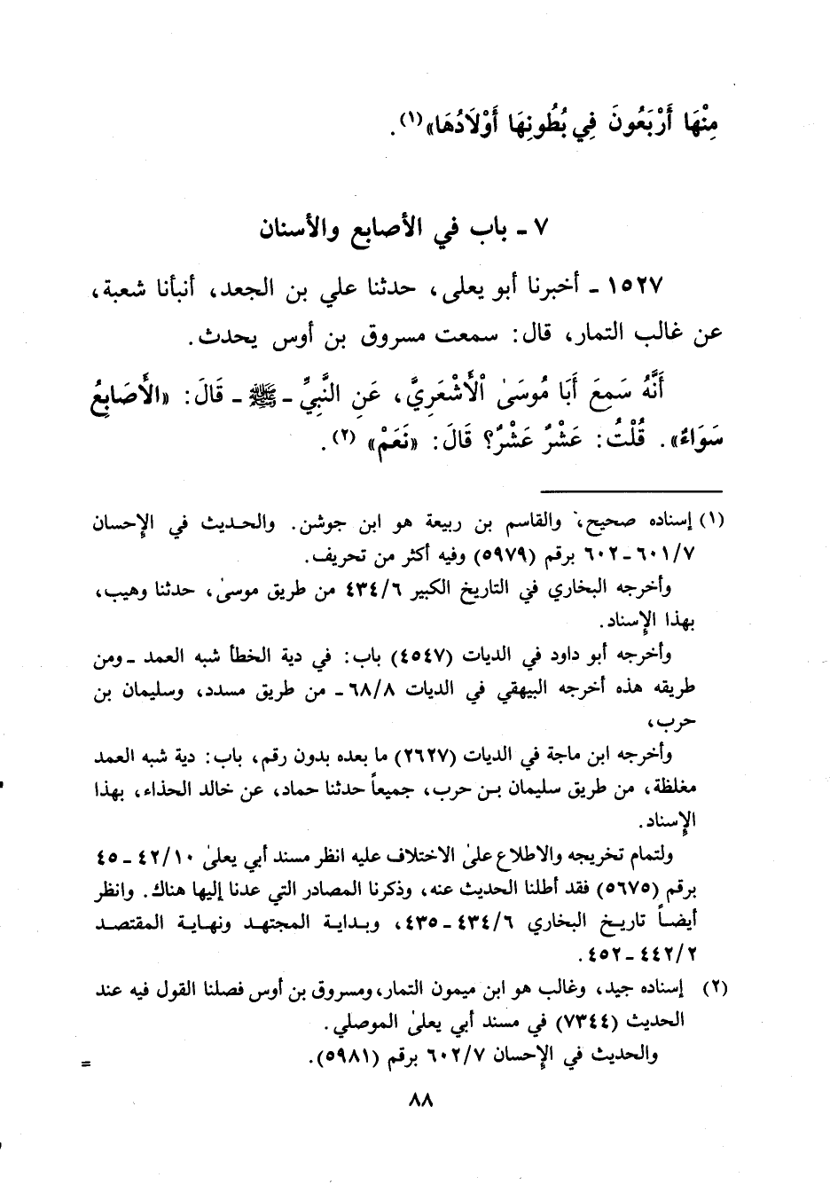 1527 - أخبرنا أبو يعلى، حدثنا علي بن الجعد، أنبأنا شعبة، عن غالب التمار، قال: سمعت مسروق بن أوس يحدث. أَنَّهُ سَمعَ أَبَا مُوسَى اْلأشْعَرِى، عَنِ النَّبِيِّ -صلى الله عليه وسلم- قَالَ: "الأَصَابِعُ سواءٌ". قُلْتُ: عَشْرٌ عَشْرٌ؟ قَالَ: "نَعَمْ" (¬2).