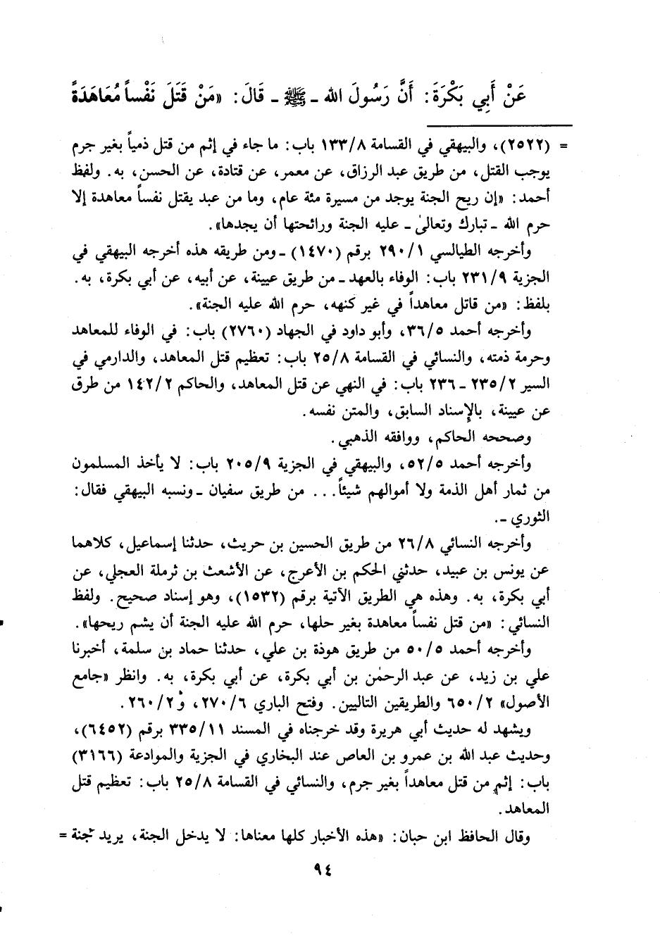 عَنْ أَبِي بَكْرَةَ: أَنَّ رَسُولَ الله -صلى الله عليه وسلم- قَالَ: "مَنْ قَتَلَ نَفْساً مُعَاهَدَةً