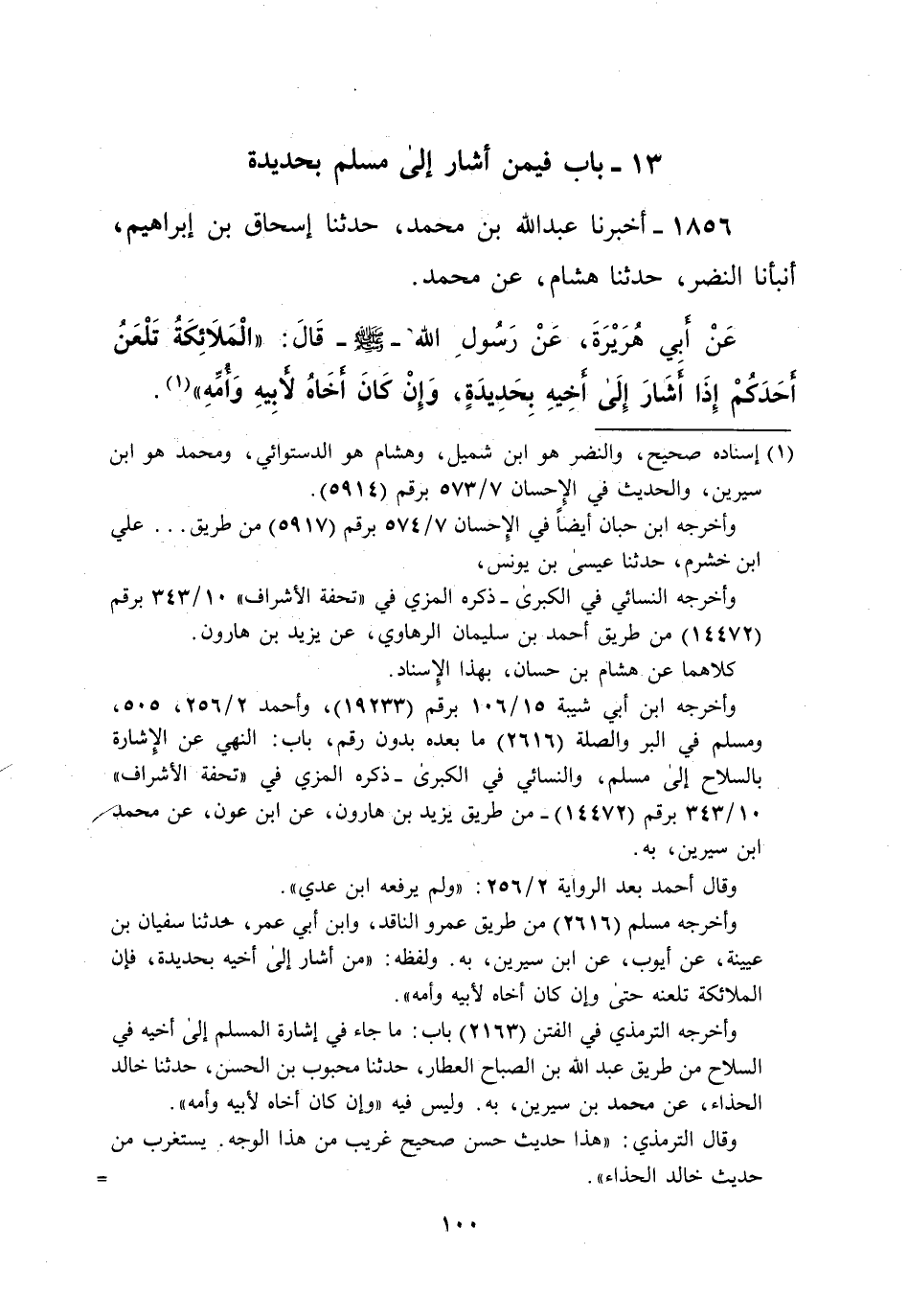 1856 - أخبرنا عبد الله بن محمد، حدثنا إسحاق بن إبراهيم، أنبأنا النضر، حدثنا هشام، عن محمد. عَنْ أبي هُرَيْرَةَ، عَنْ رَسُولِ الله -صلى الله عليه وسلم-قَال: "الْمَلاَئِكَةُ تَلْعَنُ أحَدَكُمْ إِذَا أَشَارَ إِلَى أخِيهِ بِحَدِيدَةٍ، وَإِنْ كَانَ أخَاهُ لأبِيهِ وَأمِّهِ" (¬1).