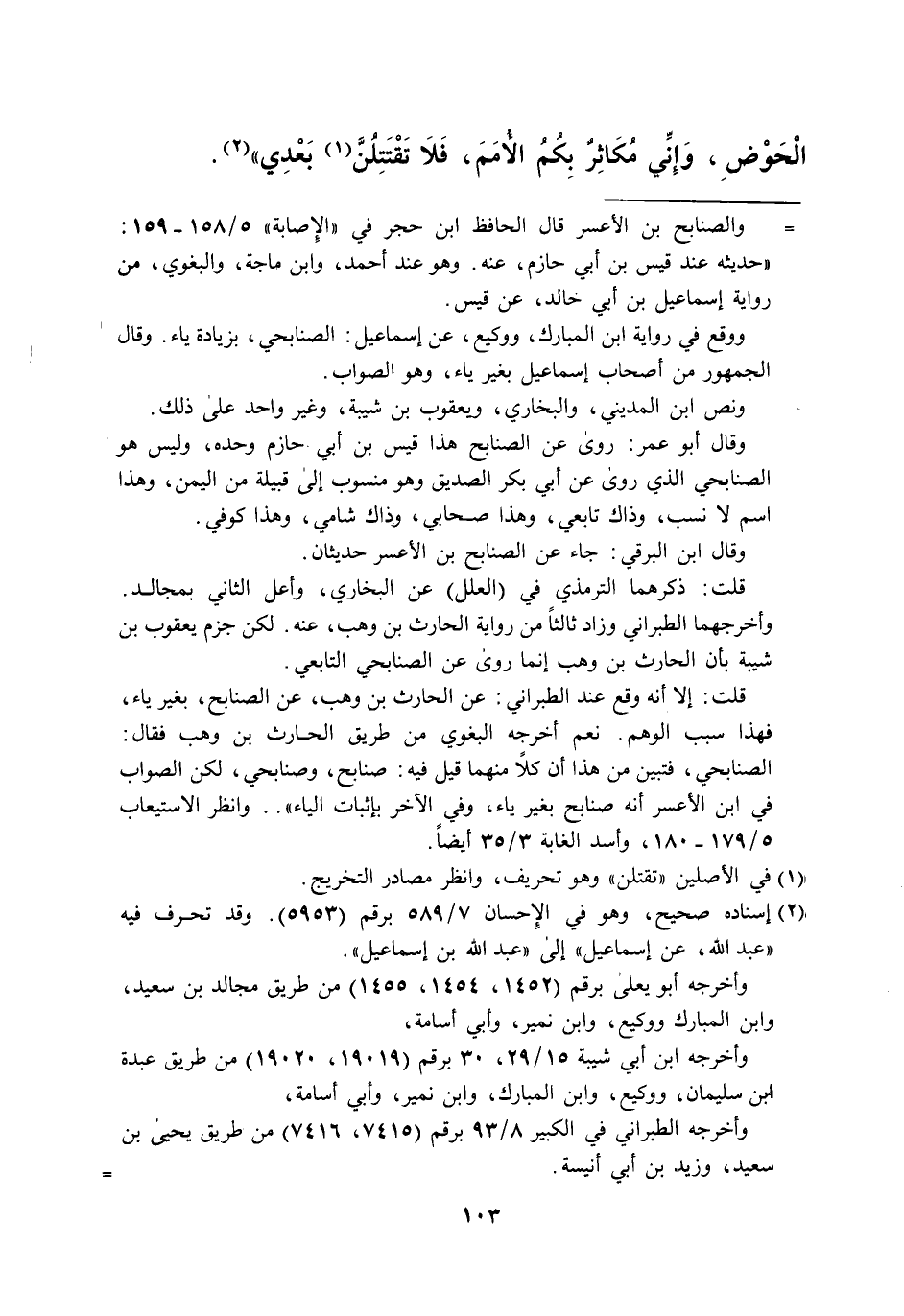 قلت: إلا أنه وقع عند الطبراني: عن الحارث بن وهب، عن الصنابح، بغير ياء، فهذا سبب الوهم. نعم أخرجه البغوي من طريق الحارث بن وهب فقال: الصنابحي، فتبين من هذا أن كلاً منهما قيل فيه: صنابح، وصنابحي، لكن الصواب في ابن الأعسر أنه صنابح بغير ياء، وفي الآخر بإثبات الياء" .. وانظر الاستيعاب 5/ 179 - 180، وأسد الغابة 3/ 35 أيضاً.