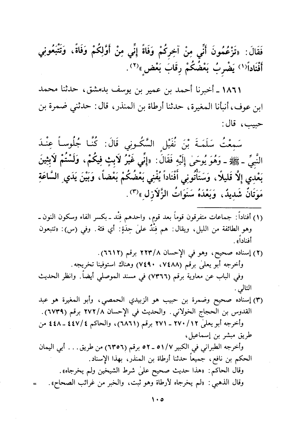1861 - أخبرنا أحمد بن عمير بن يوسف بدمشق، حدثنا محمد ابن عوف، أنبأنا المغيرة، حدثنا أرطأة بن المنذر، قال: حدثني ضمرة بن حبيب، قال: سمِعْتُ سَلَمَةَ بْنَ نُفَيْلٍ السَّكُونِي قَالَ: كُنَّا جُلُوساً عِنْدَ النَّبِيِّ-صلى الله عليه وسلم-وَهُوَ يُوحَى إِلَيْهِ فَقَالَ: "إِنِّي غَيْرُ لابِثٍ فِيكُمْ، وَلَسْتُمْ لاَبِثِينَ بَعْدِي إِلا قَليلاً، وَسَتَأْتُونِي أَفْنَاداً يُفْنِي بَعْضُكُمْ بَعْضاً، وَبَيْنَ يَدَيِ السَّاعَةِ مَوَتَانٌ شَدِيدٌ، وَبَعْدَه ُ سَنَوَاتُ الزَّلازِلِ" (¬3).
