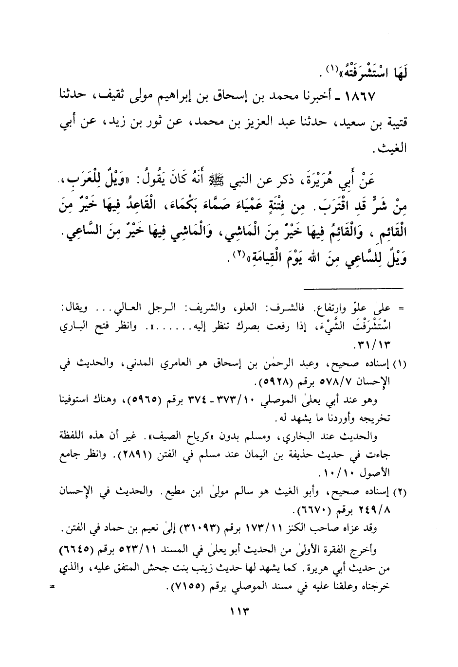1867 - أخبرنا محمد بن إسحاق بن إبراهيم مولى ثقيف، حدثنا قتيبة بن سعيد، حدثنا عبد العزيز بن محمد، عن ثور بن زيد، عن أبي الغيث. عَنْ أَبِي هُرَيْرَةَ، ذكر عن النبي-صلى الله عليه وسلم-أنَّهُ كَانَ يَقُولُ: "وَيْلٌ لِلْعَرَبِ، مِنْ شَرٍّ قَدِ اقْتَرَبَ. مِن فِتْنَةٍ عَمْيَاءَ صَمَّاءَ بَكْمَاءَ، الْقَاعِدُ فِيهَا خَيْرٌ مِنَ الْقَائِمِ، وَالْقَائِمُ فِيهَا خَيْرٌ مِنَ الْمَاشِي، وَالْمَاشِي فِيهَا خَيْرٌ مِنَ السَّاعِي. وَيْلٌ لِلسَّاعِي مِنَ الله يَوْمَ الْقِيامَةِ" (¬2).