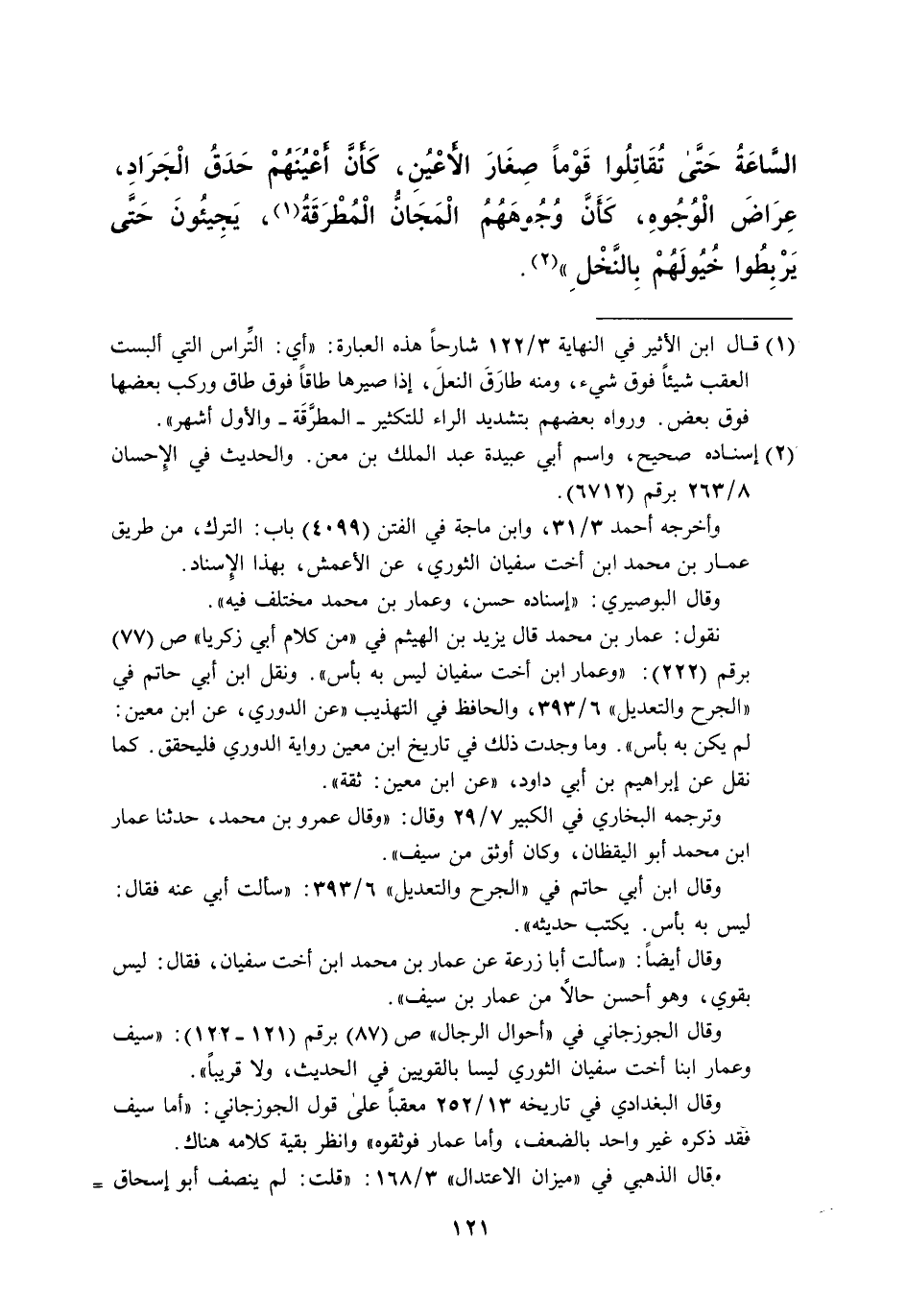 وقال البغدادي في تاريخه 13/ 252 معقباً على قول الجوزجانى: "أما سيف فقد ذكره غير واحد بالضعف، وأما عمار فوثقوه" وانظر بقية كلامه هناك.