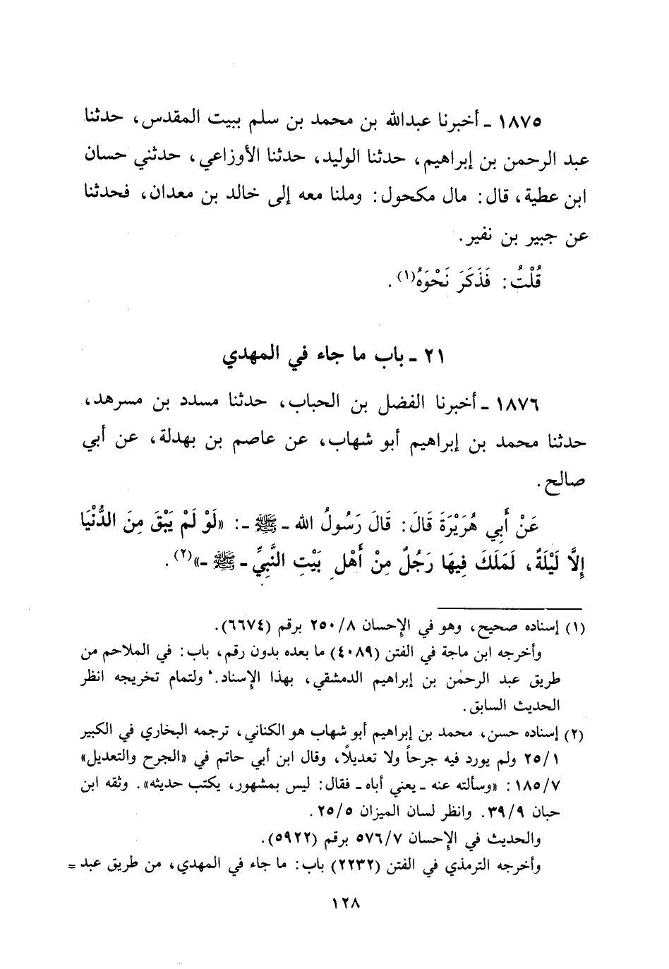 1876 - أخبرنا الفضل بن الحباب، حدثنا مسدد بن مسرهد، حدثنا محمد بن إبراهيم أبو شهاب، عن عاصم بن بهدلة، عن أبي صالح. عَنْ أبِي هُرَيْرَةَ قَالَ: قَالَ رَسولُ الله -صلى الله عليه وسلم-: "لَوْ لَمْ يَبْقَ مِنَ الدُّنْيَا إلاَّ لَيْلَةٌ، لَمَلَكَ فِيهَا رَجُلٌ مِنْ أهْلِ بَيْتِ النَّبِيِّ -صلى الله عليه وسلم- " (¬2).