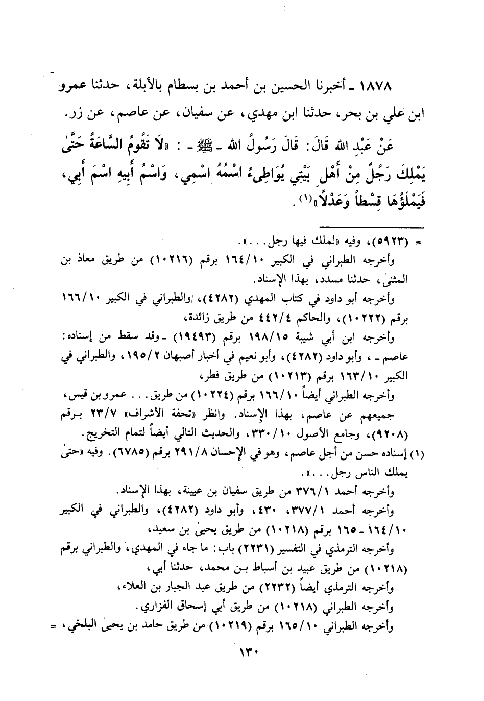 1878 - أخبرنا الحسين بن أحمد بن بسطام بالأبلة، حدثنا عمرو ابن علي بن بحر، حدثنا ابن مهدي، عن سفيان، عن عاصم، عن زر. عَنْ عَبْدِ الله قَالَ: قَالَ رَسُولُ الله-صلى الله عليه وسلم-:"لا تَقُومُ السَّاعَةُ حَتَّى يَمْلِكَ رَجُلٌ مِنْ أهْلِ بَيْتِي يُوَاطِىءُ اسْمُهُ اسْمِي، وَاسْمُ أبيه اسْمَ أبِي، فَيَمْلَؤُهَا قِسْطاً وَعَدْلا" (¬1).