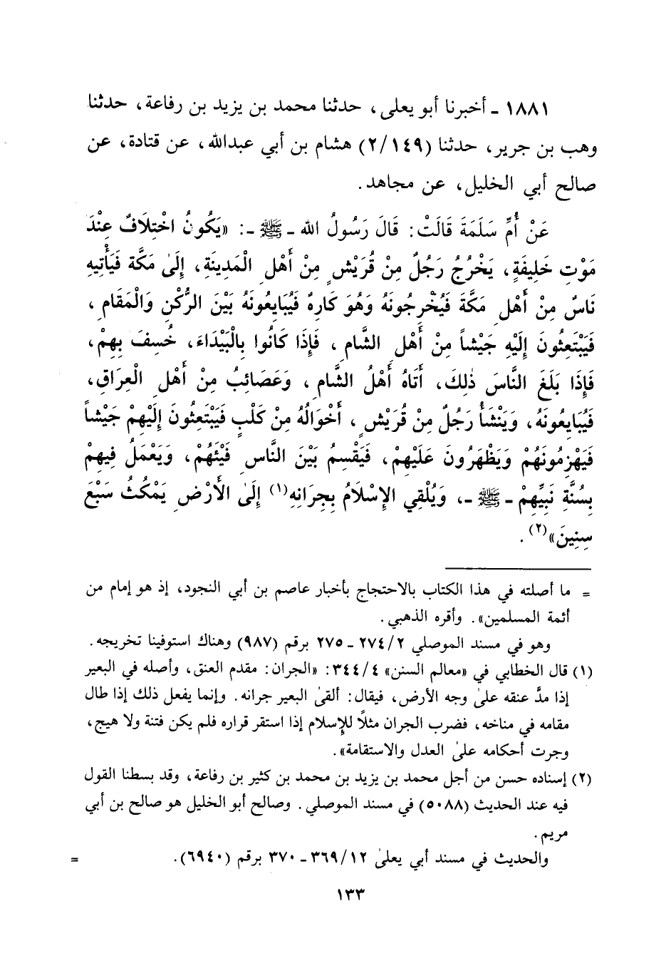 1881 - أخبرنا أبو يعلى، حدثنا محمد بن يزيد بن رفاعة، حدثنا وهب بن جرير، حدثنا (149/ 2) هشام بن أبي عبد الله، عن قتادة، عن صالح أبي الخليل، عن مجاهد. عَنْ أمِّ سَلَمَةَ قَالَتْ: قَالَ رَسُولُ الله -صلى الله عليه وسلم-: "يَكُون اخْتِلافٌ عِنْدَ مَوْتِ خَلِيفَةٍ، يَخْرُجُ رَجُلٌ مِنْ قُرَيْشٍ مِنْ أهْلِ الْمَدِينَةِ، إِلَى مَكَّة فَيَأْتيهِ نَاسٌ مِنْ أهْلِ مَكَّةَ فَيُخْرجُونَهُ وَهُوَ كَارِهٌ فَيُبَايِعُونَهُ بَيْنَ الرُّكْنِ وَالْمَقَامِ، فَيَبْتَعِثُونَ إِلَيْهِ جَيْشاً مِنْ أَهْل الشَّام، فَإِذَا كَانُوا بِالْبَيْدَاءَ، خُسِفَ بِهِمْ، فَإِذَا بَلَغَ النَّاسَ ذلِكَ، أتَاهُ أَهْلُ الشَّام، وَعَصَائِبُ مِنْ أهْلِ الْعِرَاقِ، فَيُبَايِعُونَهُ، وَيَنْشَأُ رَجُلٌ مِنْ قُرَيْشٍ، أخْوَالُهُ مِنْ كلْبٍ فَيَبْتَعِثُونَ إِلَيْهِمْ جَيْشاً فَيَهْزِمُونَهُمْ وَيَظْهَرُونَ عَلَيْهِمْ، فَيَقْسِمُ بَيْنَ النَّاسِ فَيْئَهُمْ، وَيَعْمَلُ فِيهِمْ بِسُنَّةِ نَبِيِّهِمْ -صلى الله عليه وسلم-، وَيُلْقِي الإِسْلاَمُ بِجِرَانِهِ (¬1) إِلَى الأرْضِ يَمْكُثُ سَبْعَ سِنِينَ" (¬2).