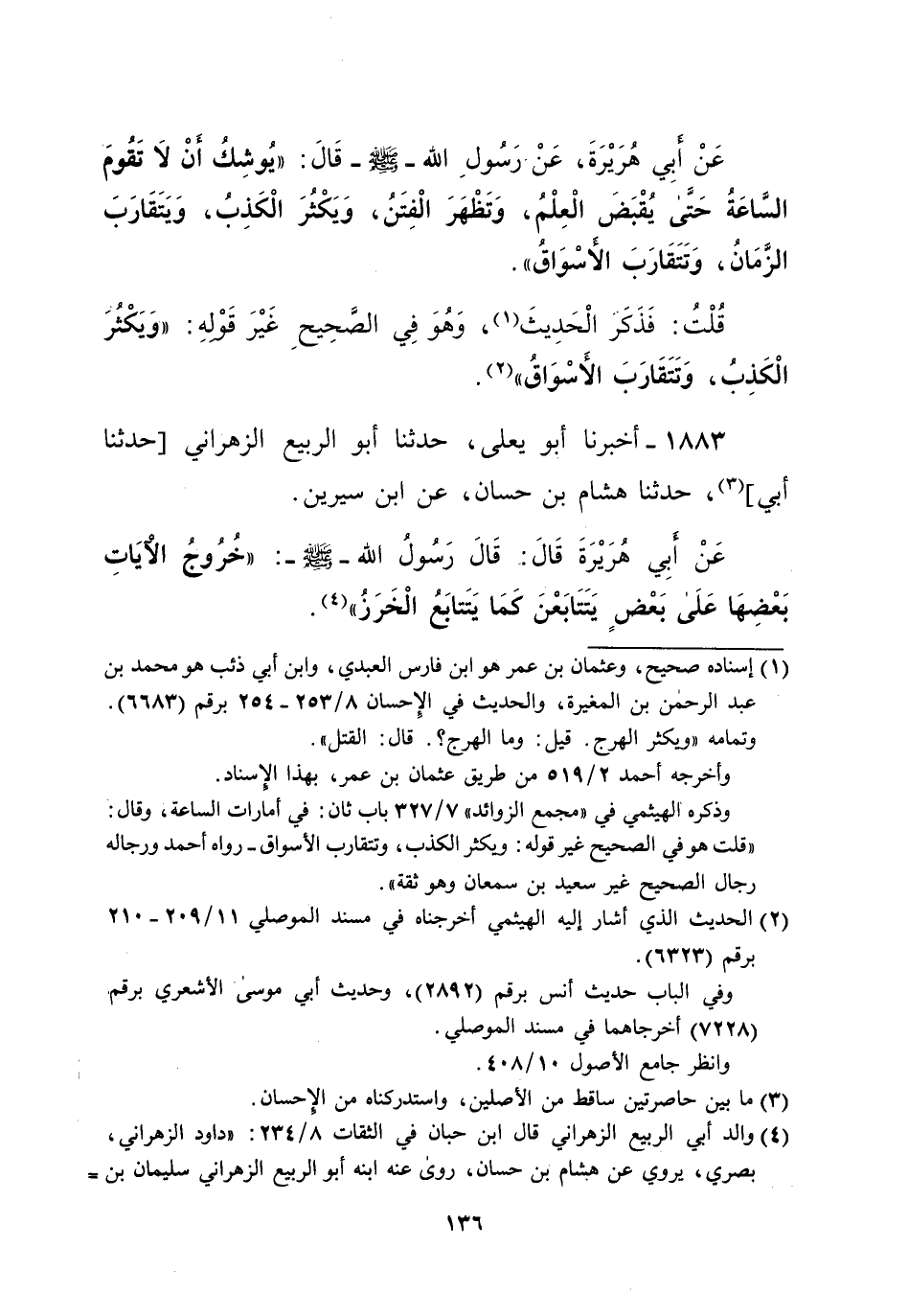 1883 - أخبرنا أبو يعلى، حدثنا أبو الربيع الزهراني [حدثنا أبي] (¬3)، حدثنا هشام بن حسان، عن ابن سيرين. عَنْ أَبِي هريرة قَالَ: قَالَ رَسُولُ الله -صلى الله عليه وسلم-: "خُرُوجُ الآيَاتِ بَعْضِهَا عَلَى بَعْضٍ يَتَتَابَعْنَ كَمَا يَتَتابَعُ الْخَرَزُ" (¬4).