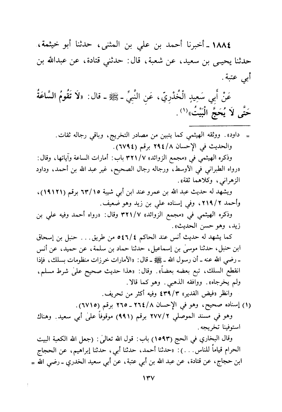 1884 - أخبرنا أحمد بن علي بن المثنى، حدثنا أبو خيثمة، حدثنا يحيى بن سعيد، عن شعبة، قال: حدثني قتادة، عن عبد الله بن أبي عتبة. عَنْ أَبِي سَعِيدٍ الْخُدْرِيّ، عَنِ النَّبِيِّ -صلى الله عليه وسلم- قال: "لا تَقُومُ السَّاعَةُ حَتَّى لا يُحَجَّ الْبَيْتُ" (¬1).