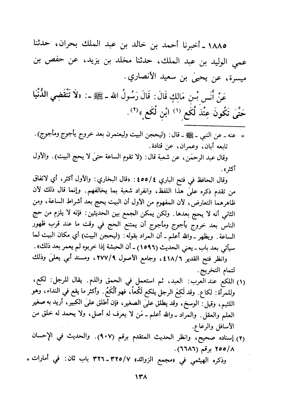 1885 - أخبرنا أحمد بن خالد بن عبد الملك بحران، حدثنا عمي الوليد بن عبد الملك، حدثنا مخلد بن يزيد، عن حفص بن ميسرة، عن يحيى بن سعيد الأنصاري. عَنْ أَنس بْنِ مَالِكٍ قَالَ: قَالَ رَسُولُ الله -صلى الله عليه وسلم-: "لا تَنْقَضِي الدُّنْيَا حَتَّى تَكونَ عِنْدَ لُكَعِ (¬1) ابْنِ لُكَعٍ" (¬2).