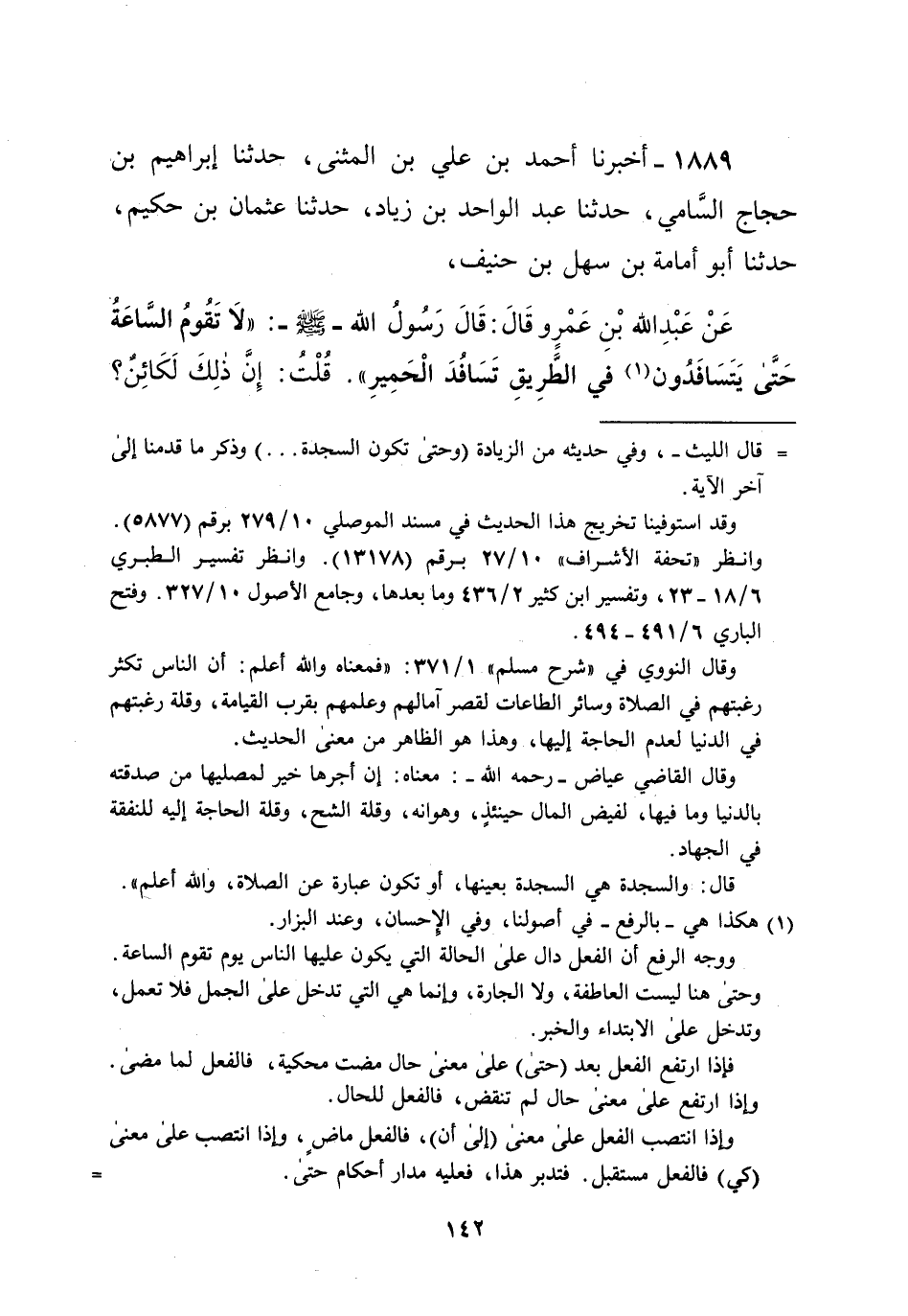 (¬1) هكذا هي- بالرفع- في أصولنا، وفي الإحسان، وعند البزار، ووجه الرفع أن الفعل دال على الحالة التي يكون عليها الناس يوم تقوم الساعة. وحتى هنا ليست العاطفة، ولا الجارة، وإانما هي التي تدخل على الجمل فلا تعمل، وتدخل على الابتداء والخبر.
