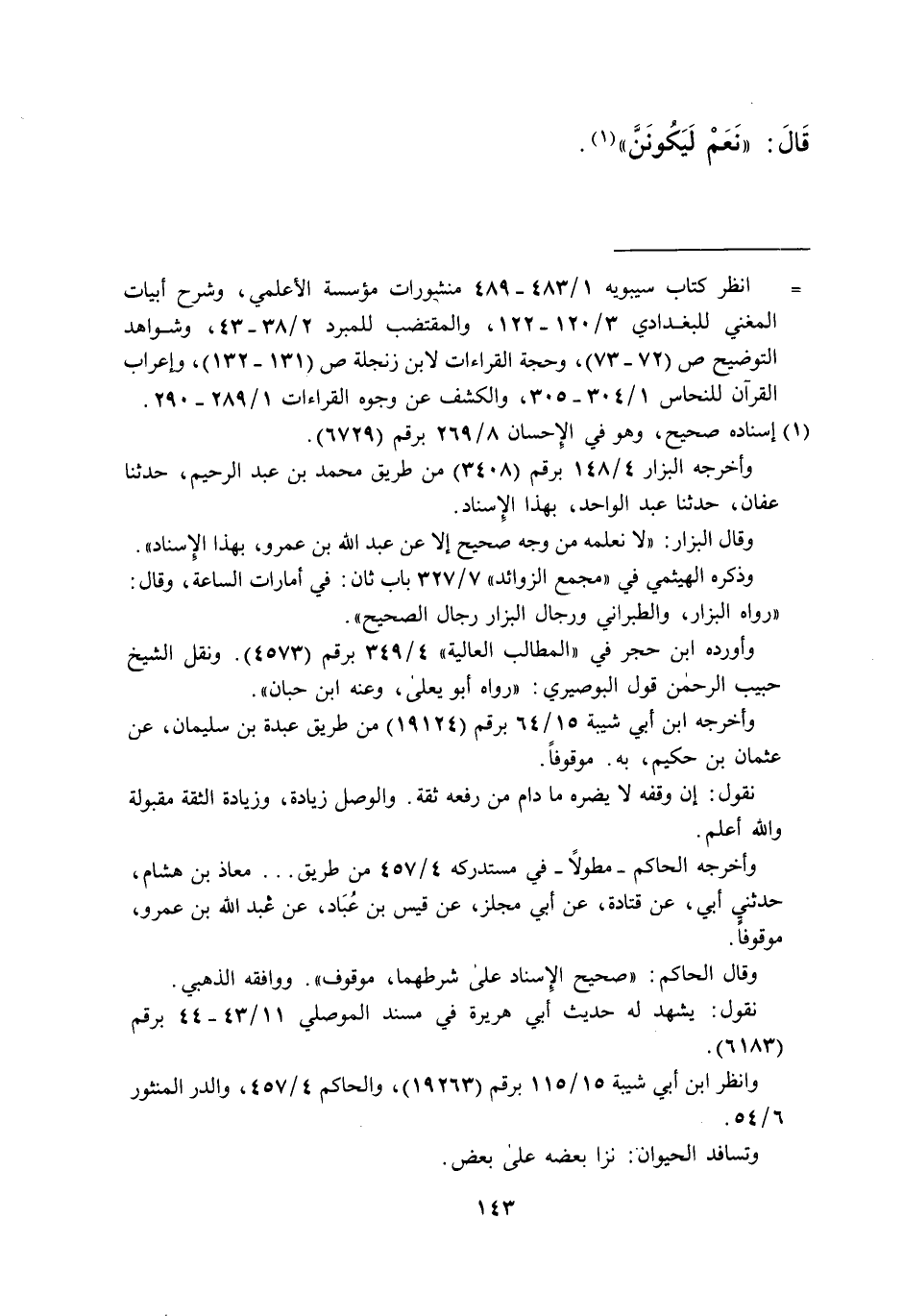 = انظر كتا ب سيبويه 1/ 483 - 489 منشورات مؤسسة الأعلمي، وشرح أبيات المغني للبغدادي 3/ 120 - 122، والمقتضب للمبرد 2/ 38 - 43، وشواهد التوضيح ص (72 - 73)، وحجة القراءات لابن زنجلة ص (131 - 132)، وإعراب القرآن للنحاص 1/ 304 - 305، والكشف عن وجوه القراءات 1/ 289 - 290.