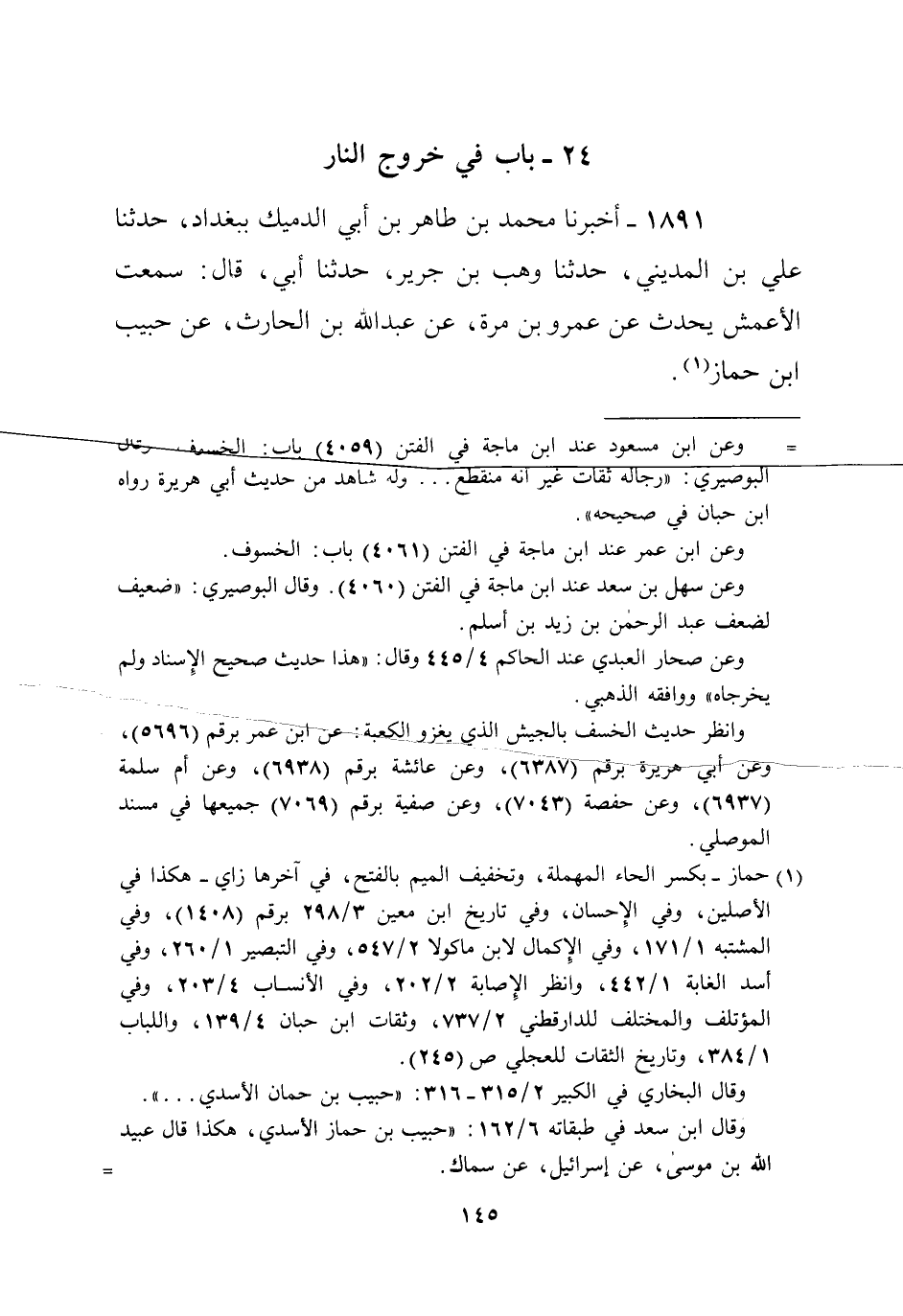 1891 - أخبرنا محمد بن طاهر بن أبي الدميك ببغداد، حدثنا علي بن المديني، حدثنا وهب بن جرير، حدثنا أبي، قال: سمعت الأعمش يحدث عن عمرو بن مرة، عن عبد الله بن الحارث، عن حبيب ابن حماز (¬1).