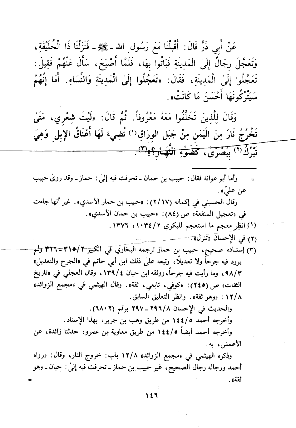 (¬3) إسناده صحيحٍ، حبيب بن حماز ترجمه البخاري في الكبير 2/ 315 - 316 ولم يورد فيه جرحا ولا تعديلاً، وتبعه على ذلك ابن أبي حاتم في "الجرح والتعديل" 3/ 98، وما رأيت فيه جرحاً، ووثقه ابن حبان 4/ 139، وقال العجلى فى "تاريخ الثقات" ص (245): "كوفي، تابعي، ثقة". وقال الهيثمي في "مجمع الزوائد" 8/ 12: "وهو ثقة". وانظر التعليق السابق.