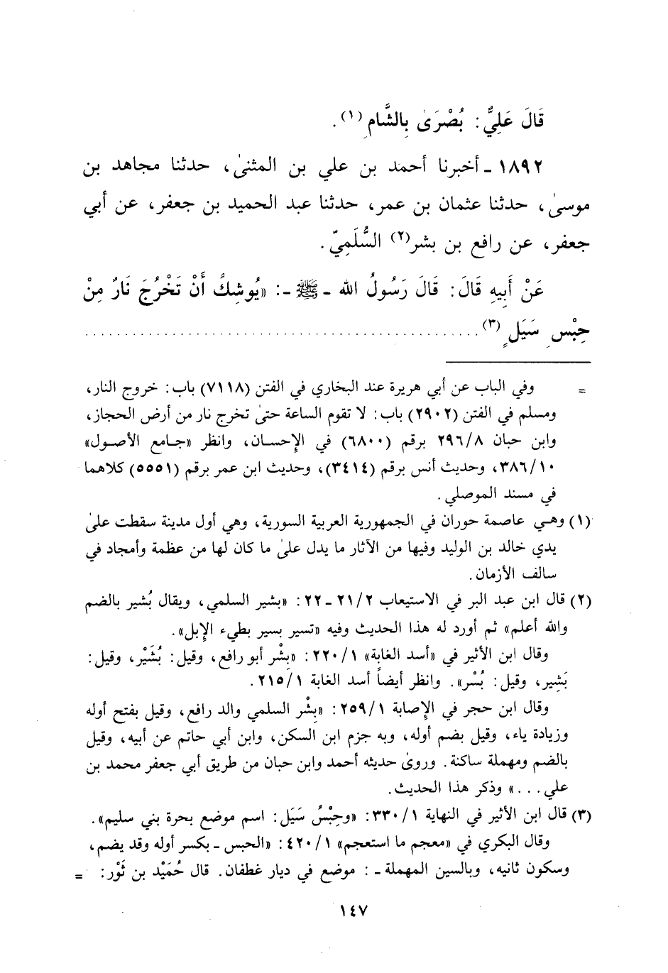 1892 - أخبرنا أحمد بن علي بن المثنى، حدثنا مجاهد بن موسى، حدثنا عثمان بن عمر، حدثنا عبد الحميد بن جعفر، عن أبي جعفر، عن رافع بن بشر (¬2) السُّلمِيّ. عَنْ أَبِيهِ قَالَ: قَالَ رَسُولُ الله -صلى الله عليه وسلم-: "يُوشِكُ أَنْ تَخْرُجَ نَارٌ مِنْ حِبْسِ سَيَلٍ (¬3). . . . . . . . . . . . . . . . . . . . . . . . . . . . . . . . .