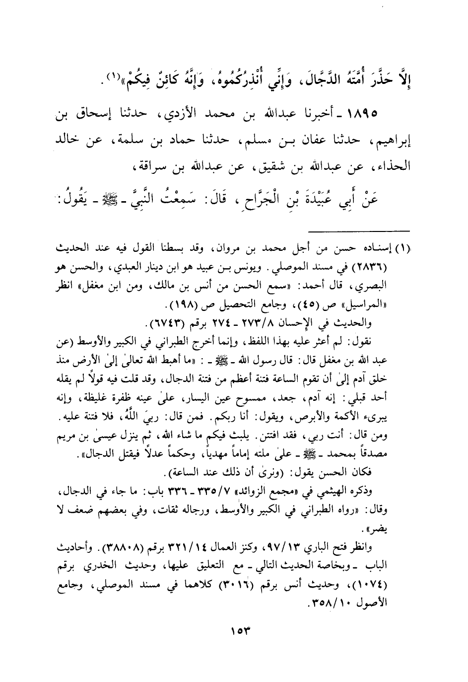 1895 - أخبرنا عبد الله بن محمد الأزدي، حدثنا إسحاق بن إبراهيم، حدثنا عفان بن مسلم، حدثنا حماد بن سلمة، عن خالد الحذاء، عن عبد الله بن شقيق، عن عبد الله بن سراقة، عَنْ أَبِي عُبَيْدَةَ بْنِ الْجَرَّاحِ، قَالَ: سَمِعْتُ النَّبِيّ -صلى الله عليه وسلم-يَقُولُ: