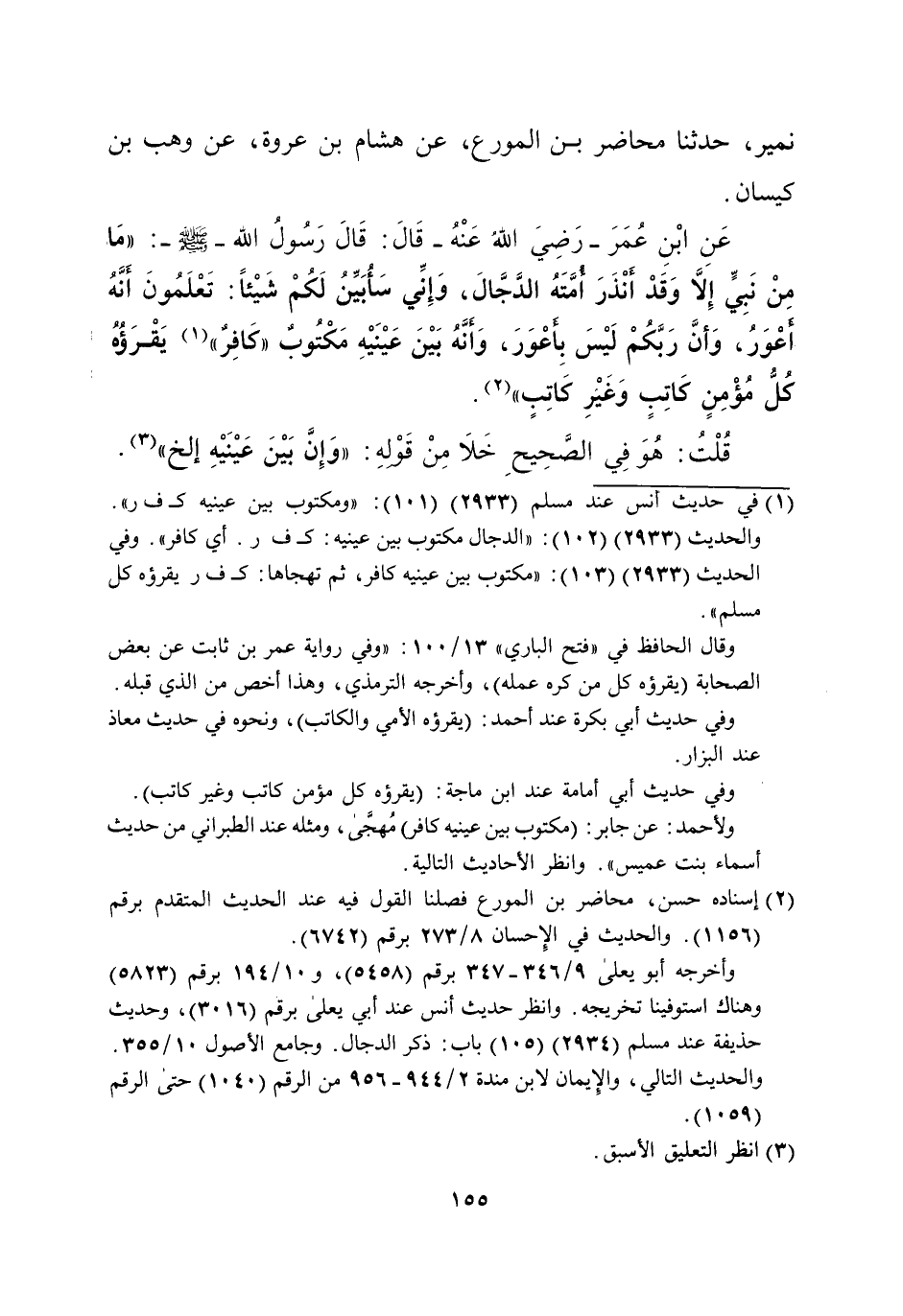 نمير، حدثنا محاضر بن المورع، عن هشام بن عروة، عن وهب بن كيسان. عَنِ ابْنِ عُمَرَ -رَضِيَ اللهُ عَنْهُ- قَالَ: قَالَ رَسُولُ الله -صلى الله عليه وسلم-: "ما مِنْ نَبِيٍّ إِلاَّ وَقَدْ أَنْذَرَ أمَّتَهُ الدَّجَّالَ، وَإِنِّي سَأُبَيِّنُ لَكُمْ شَيْئاً: تَعْلَمُونَ أَنَّهُ أعْوَرُ، وَأنَّ رَبَّكُمْ لَيْسَ بِأعْوَرَ، وَأنَّهُ بَيْنَ عَيْنَيْهِ مَكْتُوبٌ "كَافِرٌ" (¬1) يَقْرَؤُهُ كُلُّ مُؤْمِنٍ كَاتِبٍ وغير كَاتِبٍ" (¬2).