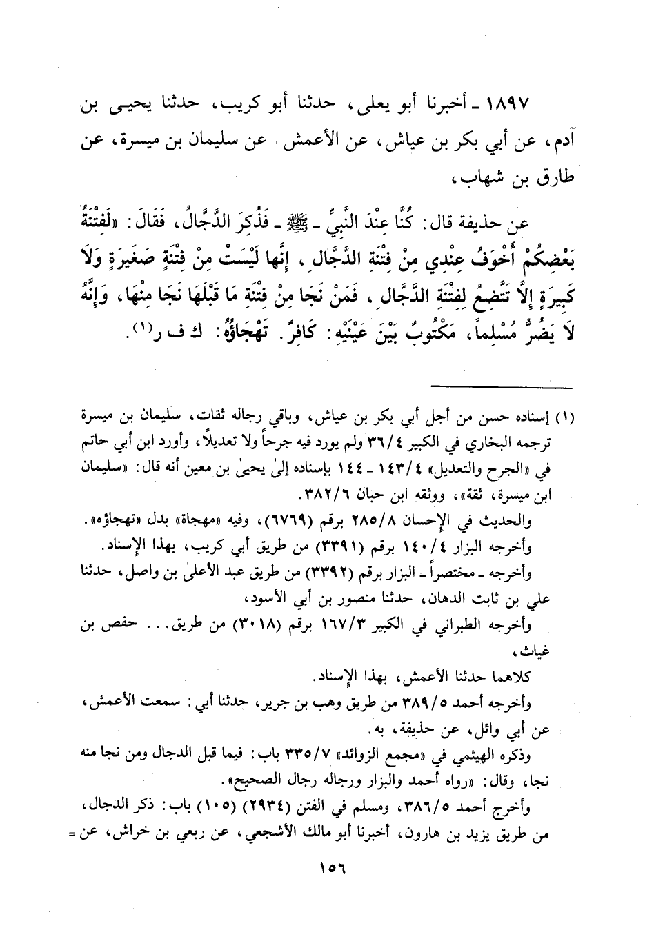 1897 - أخبرنا أبو يعلى، حدثنا أبو غريب، حدثنا يحيى بن آدم، عن أبي بكر بن عياش، عن الأعمش عن سليمان بن ميسرة، عن طارق بن شهاب، عن حذيفة قال: كُنَّا عِنْدَ النَّبِيِّ -صلى الله عليه وسلم- فَذُكِرَ الدجال، فَقَالَ: "لَفِتْنةُ بَعْضِكُمْ أخْوَفُ عِنْدِي مِنْ فِتْنَةِ الدَّجَّالِ، إِنَّها لَيْسَتْ مِنْ فِتْنَةٍ صغيرة وَلا كَبِيرَةٍ إِلا تَتَّضِعُ لِفِتْنَةِ الدَّجَّالِ، فَمَنْ نَجَا مِنْ فِتْنَةِ مَا قَبْلَهَا نَجَا مِنْهَا، وَإِنَّهُ لاَ يَضُرُّ مُسْلِماً، مَكْتُوبٌ بَيْنَ عَيْنَيْهِ: كَافِرٌ. تَهْجَاؤه: ك ف ر (¬1).