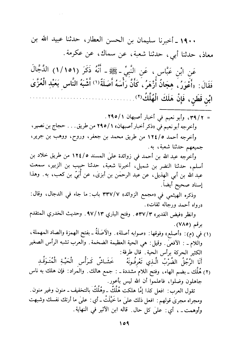 1900 - أخبرنا سليمان بن الحسن العطار، حدثنا عبيد الله بن معاذ، حدثنا أبي، حدثنا شعبة، عن سماك، عن عكرمة. عَنِ ابْنِ عَبَّاسَ، عَنِ النَّبِيِّ -صلى الله عليه وسلم- أَنَّهُ ذَكَرَ (151/ 1) الدَّجَّالَ فَقَال: "أَعْوَرُ، هِجَانٌ أَزْهَرُ، كَأَنَّ رَأْسَهُ أَصَلَة (¬1) أَشْبَهُ النَّاسِ بَعَبْدِ الْعُزَّى ابْنِ قَطَنٍ، فَإِن هَلَكَ الْهُلَّكُ (¬2). . . . . . . . . . . . . . . . . . . . . . . . . .