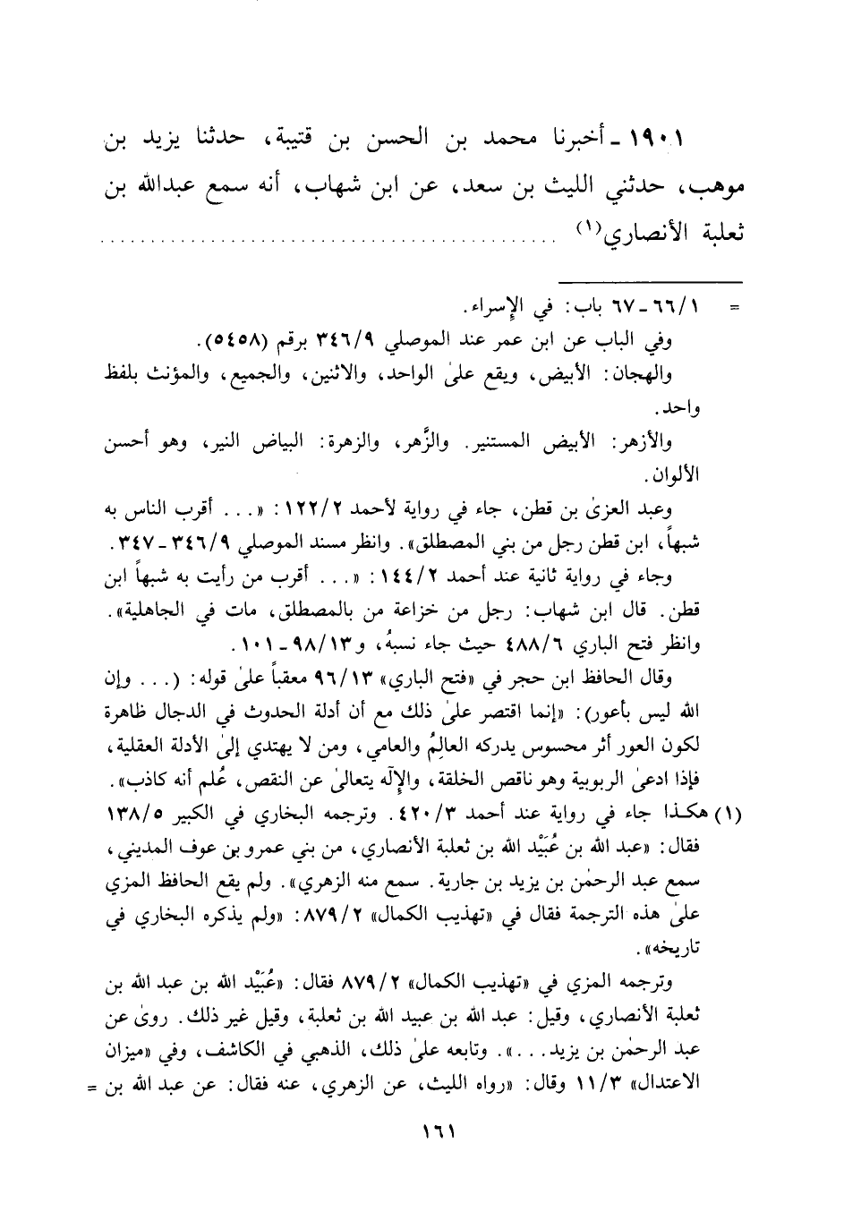 وترجمه المزي في "تهذيب الكمال" 2/ 879 فقال: "عبيد الله بن عبد الله بن ثعلبة الأنصاري، وقيل: عبد الله بن عبيد الله بن ثعلبة، وقيل غير ذلك. روى عن عبد الرحمن بن يزيد ... ". وتابعه على ذلك، الذهبي في الكاشف، وفي "ميزان الاعتدال" 3/ 11 وقال: "رواه الليث، عن الزهري، عنه فقال: عن عبد الله بن =