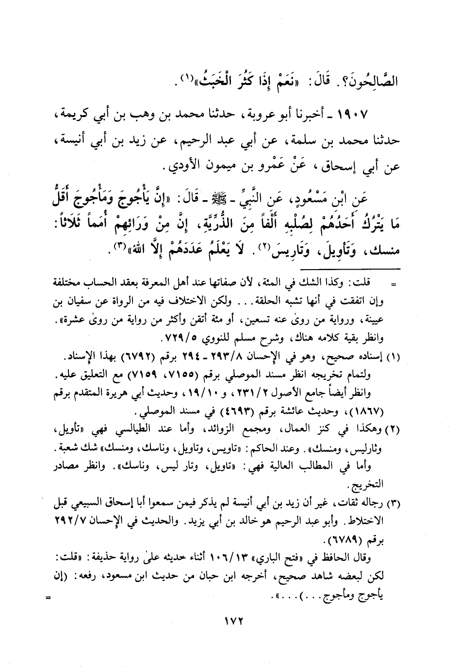 1907 - أخبرنا أبو عروبة، حدثنا محمد بن وهب بن أبي كريمة، حدثنا محمد بن سلمة، عن أبي عبد الرحيم، عن زيد بن أبي أنيسة، عن أبي إسحاق، عَنْ عَمْرو بن ميمون الأودي. عَنِ ابْنِ مَسْعُودٍ، عَنِ النَّبِيِّ -صلى الله عليه وسلم- قَالَ: "إِنَّ يَأْجُوجَ وَمَأْجُوجَ أقَلُّ مَا يَتْرُكُ أحَدُهُمْ لِصُلْبِهِ ألْفاً مِنَ الذُّرِّيَّةِ، إِنَّ مِنْ وَرَائِهِمْ أمَماً ثَلاَثاً: منسك، وَتَأوِيلَ، وَتَارِيسَ (¬2). لا يَعْلَمُ عَدَدَهُمْ إِلا اللهُ" (¬3).