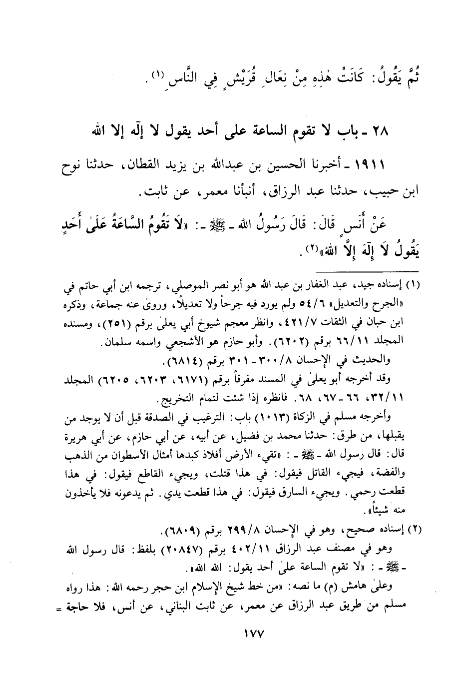 1911 - أخبرنا الحسين بن عبد الله بن يزيد القطان، حدثنا نوح ابن حبيب، حدثنا عبد الرزاق، أنبأنا معمر، عن ثابت. عَنْ أَنَسٍ قَالَ: قَالَ رَسُولُ الله -صلى الله عليه وسلم-: "لا تَقُومُ السَّاعَةُ عَلَى أَحدٍ يَقُولُ لا إِلهَ إِلاَ اللهُ" (¬2).