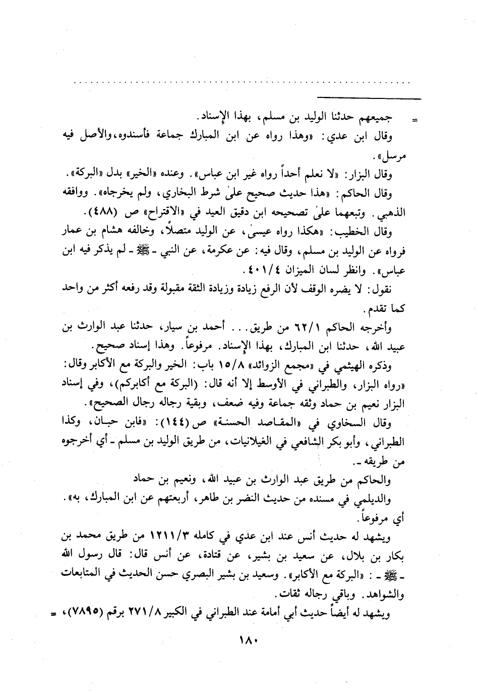 وقال الخطيب: "هكذا رواه عيسى، عن الوليد متصلاً، وخالفه هشام بن عمار فرواه عن الوليد بن مسلم، وقال فيه: عن عكرمة، عن النبي - صلى الله عليه وسلم-لم يذكر فيه ابن عباس". وانظر لسان الميزان 4/ 401.