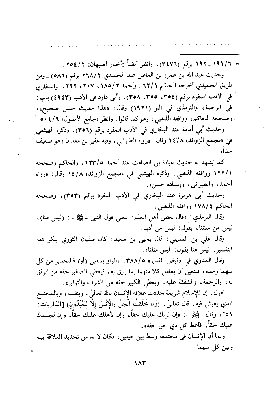 =6/ 191 - 192 برقم (3476). وانظر أيضاً "أخبار أصبهان" 2/ 254. وحديث عبد الله بن عمرو بن العاص عند الحميدي 2/ 268 برقم (586) - ومن طريق الحميدي أخرجه الحاكم 1/ 62 - وأحمد 2/ 185، 207، 222، والبخاري في الأدب المفرد برقم (354، 355، 358)، وأبىِ داود في الأدب (4943) باب: في الرحمة، والترمذي في البر (1921) وقال: "هذا حديث حسن صحيح "،