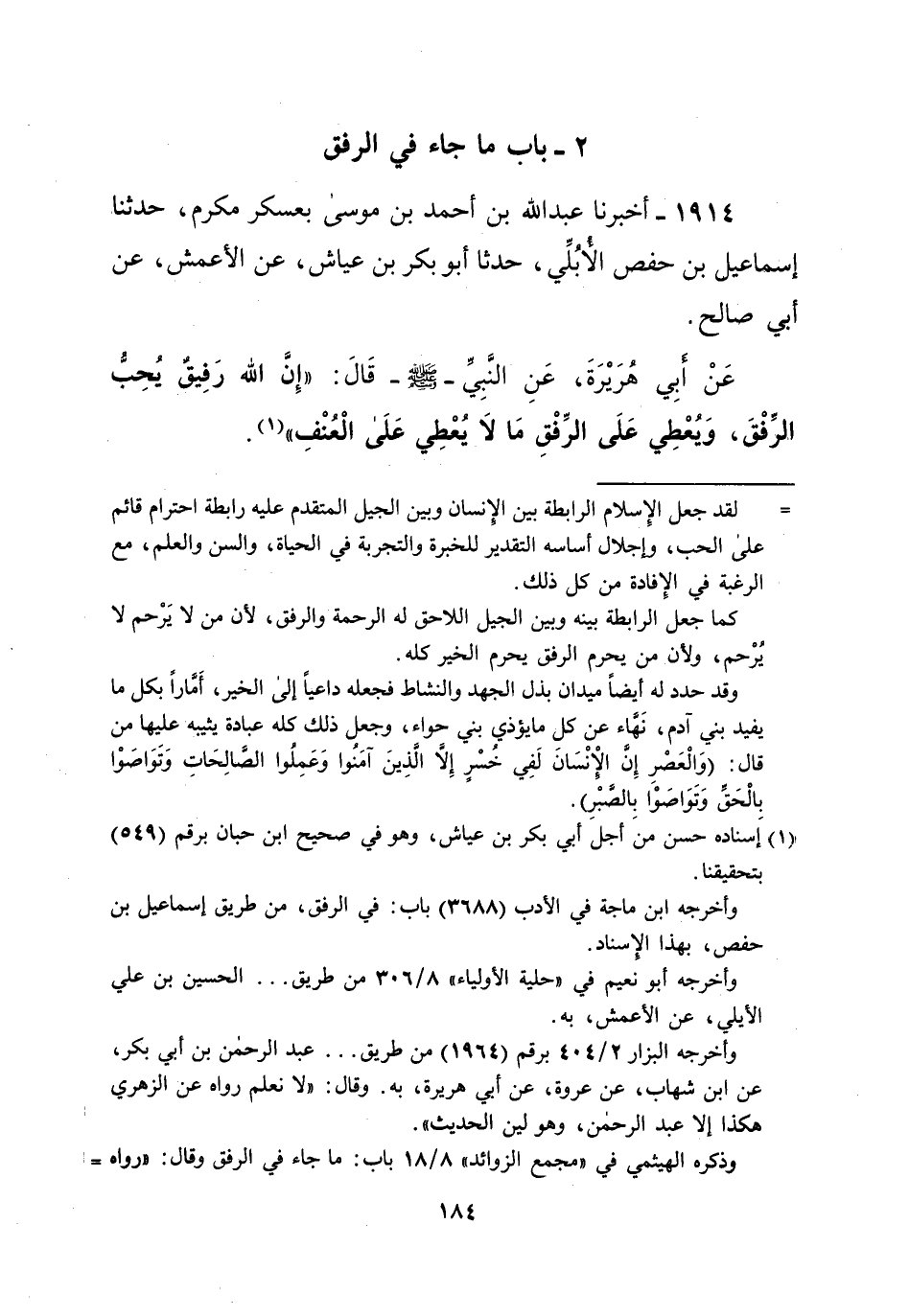 1914 - أخبرنا عبد الله بن أحمد بن موسى بعسكر مكرم، حدثنا إسماعيل بن حفص الأُبُلِّي، حدثا أبو بكر بن عياش، عن الأعمش، عن أبي صالح. عَنْ أبِي هُرَيْرَةَ، عَنِ النَّبِيِّ -صلى الله عليه وسلم- قَالَ: "إِنَّ الله رَفِيقٌ يُحِبُّ الرِّفْقَ، وَيُعْطِي عَلَى الرِّفْقِ مَا لا يُعْطِي عَلَى الْعُنْفِ" (¬1).