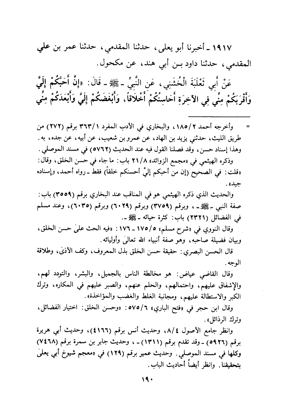 1917 - أخبرنا أبو يعلى، حدثنا المقدمي، حدثنا عمر بن علي المقدمي، حدثنا داود بن أبي هند، عن مكحول. عَنْ أَبِي ثَعْلَبَةَ الْخُشَنِي، عَنِ النَّبِي -صلى الله عليه وسلم- قَالَ: "إِنَّ أَحبَّكُمْ إِلَيَّ وَأقْرَ بَكُمْ مِنِّي فِي الآخِرَةِ أحَاسِنُكُمْ أخْلاقاً، وَأبْغَضَكُمْ إِلَيَّ وَأبْعَدَكمْ مِنِّي