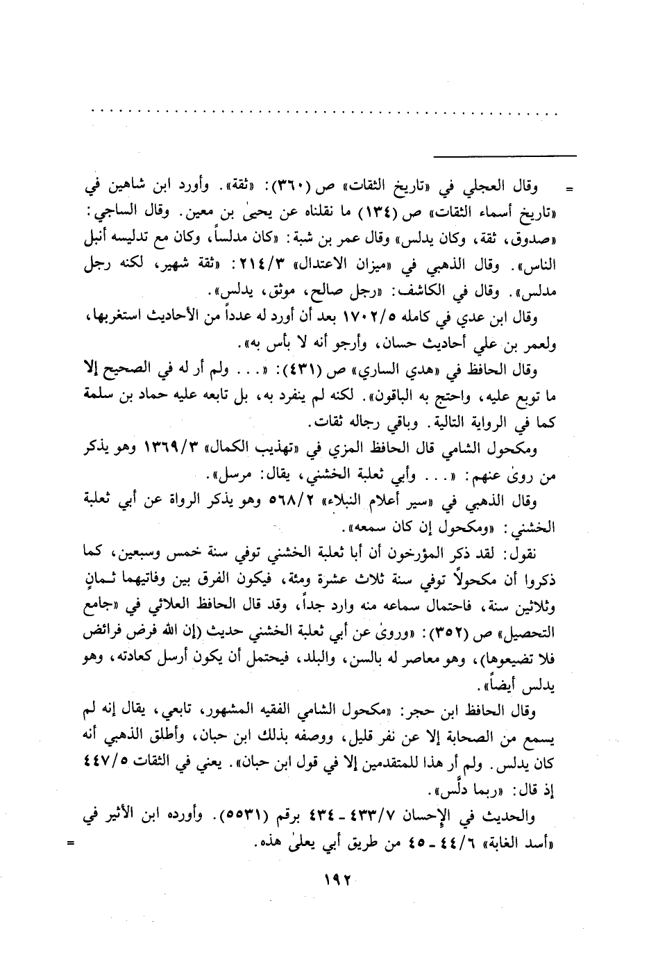 نقول: لقد ذكر المؤرخون أن أبا ثعلبة الخشني توفي سنة خمس وسبعين، كما ذكروا أن مكحولاً توفي سنة ثلاث عشرة ومئة، فيكون الفرق بين وفاتيهما ثمانٍ وثلاثين سنة، فاحتمال سماعه منه وارد جداً، وقد قال الحافظ العلائي في "جامع التحصيل" ص (352): "وروى عن أبي ثعلبة الخشني حديث (إن الله فرض فرائض فلا تضيعوها)، وهو معاصر له بالسن، والبلد، فيحتمل أن يكون أرسل كعادته، وهو يدلس أيضاً".