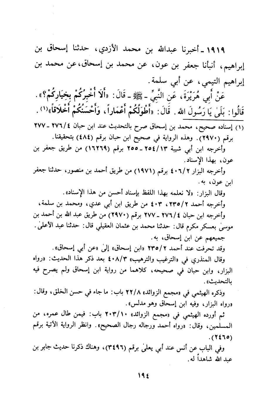 1919 - أخبرنا عبد الله بن محمد الأزدي، حدثنا إسحاق بن إبراهيم، أنبأنا جعفر بن عون، عن محمد بن إسحاق، عن محمد بن إبراهيم التيمي، عن أبي سلمة. عَنْ أبِي هُرَيْرَةَ، عَنِ النَّبِيِّ -صلى الله عليه وسلم- قَالَ: "ألا أُخْبِرُكُمْ بخِيَارِكُمْ؟ ". قَالُوا: بَلَى يَا رسول الله. قَالَ: "أطْوَلُكُمْ أعْمَاراً، وَأحْسَنُكُمْ أَخْلاقاً" (¬1).