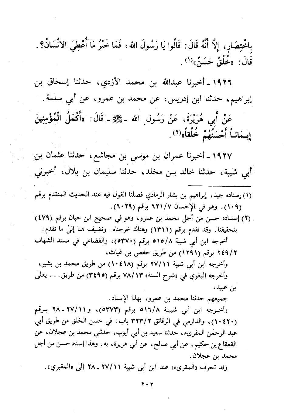 1926 - أخبرنا عبد الله بن محمد الأزدي، حدثنا إسحاق بن إبراهيم، حدثنا ابن إدريس، عن محمد بن عمرو، عن أبي سلمة. عَنْ أبِي هرَيْرَةَ، عَنْ رَسُولِ الله -صلى الله عليه وسلم- قَالَ: "أكْمَلُ الْمُؤْمِنِينَ إِيمَاناً أحْسَنُهُمْ خُلُقاً" (¬2).