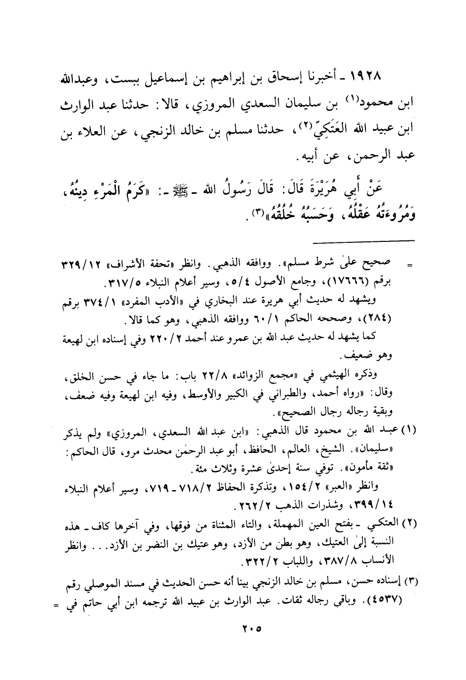 1928 - أخبرنا إسحاق بن إبراهيم بن إسماعيل ببست، وعبد الله ابن محمود (¬1) بن سليمان السعدي المروزيِ، قالا: حدثنا عبد الوارث ابن عبيد الله العَتَكِيّ (¬2)، حدثنا مسلم بن خالد الزنجي، عن العلاء بن عبد الرحمن، عن أبيه. عَنْ أبِي هريرة قَالَ: قَالَ رَسُولُ الله -صلى الله عليه وسلم-: "كَرَمُ الْمَرْءِ دِينُهُ، وَمُرُوءَتُهُ عَقْلُهُ، وَحَسَبُهُ خُلُقُهُ" (¬3).