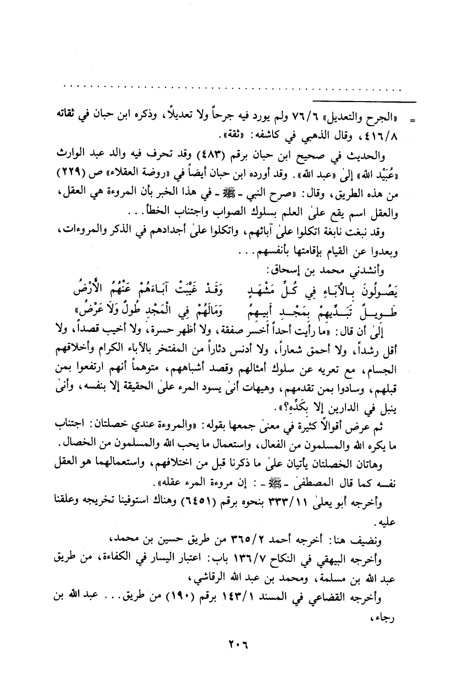 والحديث في صحيح ابن حبان برقم (483) وقد تحرف فيه والد عبد الوارث "عُبَيْد الله" إلى "عبد الله". وقد أورده ابن حبان أيضاً في "روضة العقلاء" ص (229) من هذه الطريق، وقال: "صرح النبي -صلى الله عليه وسلم -في هذا الخبر بأن المروءة هي العقل، العقل اسم يقع على العلم بسلوك الصواب واجتناب الخطأ ... وقد نبغت نابغة اتكلوا على آبائهم، واتكلوا على أجدادهم في الذكر والمروءات، وبعدوا عن القيام بإقامتها بأنفسهم ... وأنشدني محمد بن إسحاق:
