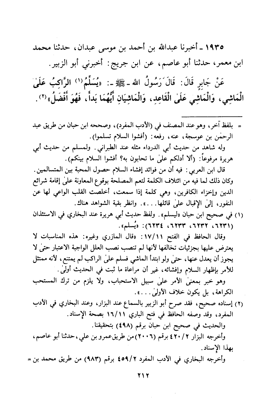 1935 - أخبرنا عبد الله بن أحمد بن موسى عبد ان، حدثنا محمد ابن معمر، حدثنا أبو عاصم، عن ابن جريج: أخبرني أبو الزبير. عَنْ جَابِرٍ قَالَ: قَالَ رَسُولُ الله -صلى الله عليه وسلم-: "يُسَلِّمُ (¬1) الرَّاكِبُ عَلَى الماشِي، وَالْمَاشِي عَلَى الْقَاعِدِ، وَالْمَاشِيَانِ أيُّهُمَا بَدأَ، فَهُوَ أَفْضَلُ" (¬2).