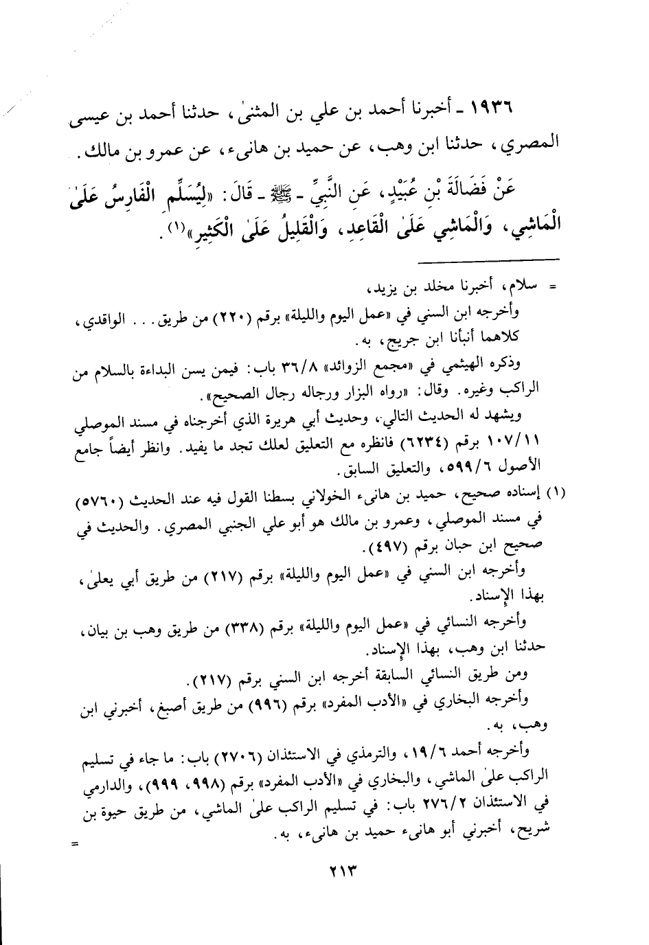 1936 - أخبرنا أحمد بن علي بن المثنى، حدثنا أحمد بن عيسى المصري، حدثنا ابن وهب، عن حميد بن هانئ، عن عمرو بن مالك. عَنْ فَضَالَةَ بْنِ عُبَيْدٍ، عَنِ النَّبِيِّ -صلى الله عليه وسلم- قَالَ: "ليسلِّم الْفَارِسُ عَلَى الْمَاشِي، وَالْمَاشِي عَلَى الْقَاعِدِ، وَالْقَلِيلُ عَلَى الْكَثِيرِ" (¬1).