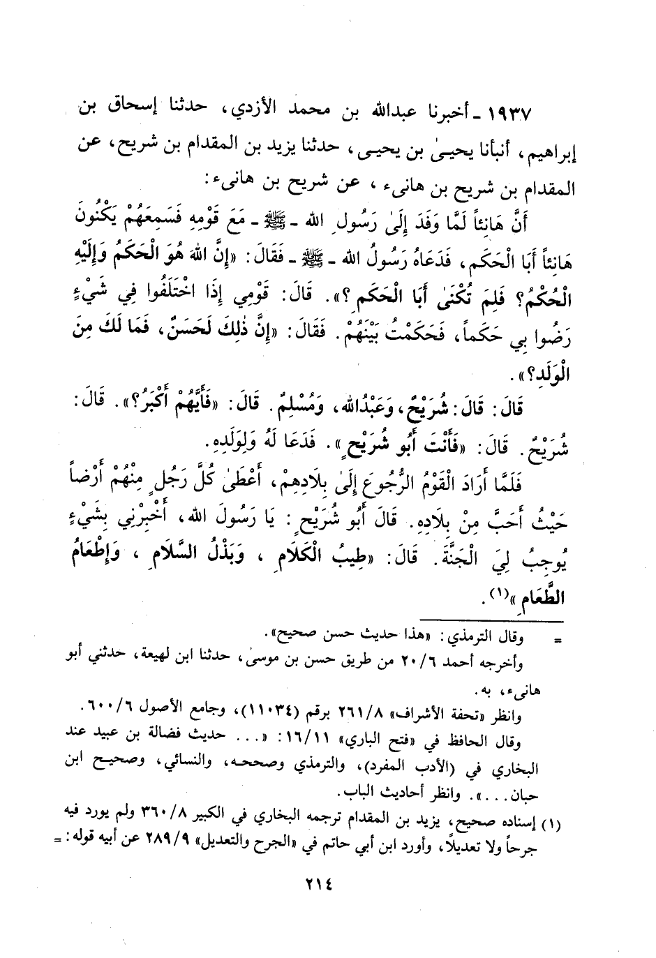 1937 - أخبرنا عبد الله بن محمد الأزدي، حدثنا إسحاق بن إبراهيم، أنبأنا يحيى بن يحيى، حدثنا يزيد بن المقدام بن شريح، عن المقدام بن شريح بن هانئ، عن شريح بن هانئ: أَنَّ هَانِئاً لَمَّا وَفَدَ إِلَى رَسُولِ الله -صلى الله عليه وسلم- مَعَ قَوْمِهِ فَسَمِعَهُمْ يَكْنُونَ هَانِئاً أَبَا الْحَكَم، فَدَعَاهُ رَسُولُ الله -صلى الله عليه وسلم- فَقَالَ: "إِنَّ اللهَ هُوَ الْحَكَمُ وَإِلَيْهِ الْحُكْمُ؟ فَلِمَ تُكْنَى أَبَا الْحَكَمِ؟ ". قَالَ: قَوْمِي إِذَا اخْتَلَفُوا فِي شَيْءٍ رَضُوا بِي حَكَماً، فَحَكَمْتُ بَيْنَهُمْ. فَقَالَ: "إِنَّ ذلِكَ لَحَسَنٌ، فَمَا لَكَ مِنَ الْوَلَدِ؟ ". قَالَ: قَال: شُرَيْحٌ، وَعَبْدُ الله، وَمُسْلِمٌ. قَالَ: "فَأيَّهُمْ أَكْبَرُ؟ ". قَالَ: شُرَيْحٌ. قَالَ: "فَأنْتَ أبُو شُرَيْحٍ". فَدَعَا لَهُ وَلِوَلَدِهِ. فَلَمَّا أَرَادَ الْقَوْمُ الرُّجُوعَ إِلَى بِلادِهِمْ، أعْطَى كُلَّ رَجُلٍ مِنْهُمْ أرْضاً حَيْثُ أحَبَّ مِنْ بِلاَدِهِ. قَالَ أَبُو شُرَيْحٍ: يَا رسول الله، أَخْبِرْنِي بِشَيْءٍ يُوجِبُ لِيَ الْجَنَّةَ. قَالَ: "طِيبُ الْكَلامِ، وَبَذْلُ السَّلامِ، وَإِطْعَامُ الطعَامَ" (¬1).