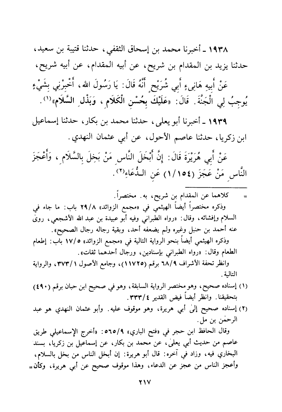 1938 - أخبرنا محمد بن إسحاق الثقفي، حدثنا قتيبة بن سعيد، حدثنا يزيد بن المقدام بن شريح، عن أبيه المقدام، عن أبيه شريح، عَنْ أَبِيهِ هَانِىءٍ أَبِي شُرَيْحٍ أنَّهُ قَالَ: يَا رسول الله، أخْبِرْنِي بشَيْءٍ يُوجِبُ لِي الْجَنَّةَ. قَالَ: "عَلَيْكَ بِحُسْنِ الْكَلاَمِ، وَبَذْلِ السَّلام" (¬1).