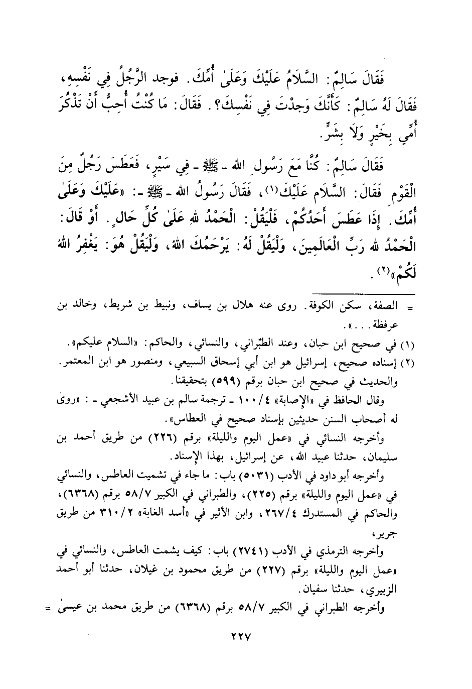 فَقَالَ سَالِمٌ: السَّلامُ عَلَيْكَ وَعَلَى أُمِّكَ. فوجد الرَّجُلُ فِي نَفْسِهِ، فَقَالَ لَهُ سَالِمٌ: كَأَنَّكَ وَجدْتَ فِي نَفْسِكَ؟. فَقَالَ: مَا كُنْتُ أُحِبُّ أن تَذْكُرَ أُمِّي بِخَيْرٍ وَلا بِشَرٍّ. فَقَالَ سَالِمٌ: كُنَّا مَعَ رَسُولِ الله -صلى الله عليه وسلم- فِي سَيْرٍ، فَعَطَسَ رَجُلٌ مِنَ الْقَوْم فَقَالَ: السَّلام عَلَيْكَ (¬1)، فَقَالَ رَسُولُ الله -صلى الله عليه وسلم-: "عَلَيْكَ وَعَلَى أمكَ. إِذَا عَطَسَ احَدُكلمْ، فَلْيَقُلْ: الْحَمْدً للهِ عَلَى كُلِّ حَالٍ. أوْ قَالَ: الْحَمْدُ لله رَبِّ الْعَالَمِينَ، وَلْيَقُلْ لَهُ: يَرْحَمُكَ اللهُ، وَلْيَقُلْ هُوَ: يَغْفِرُ اللهُ لَكُمْ" (¬2).