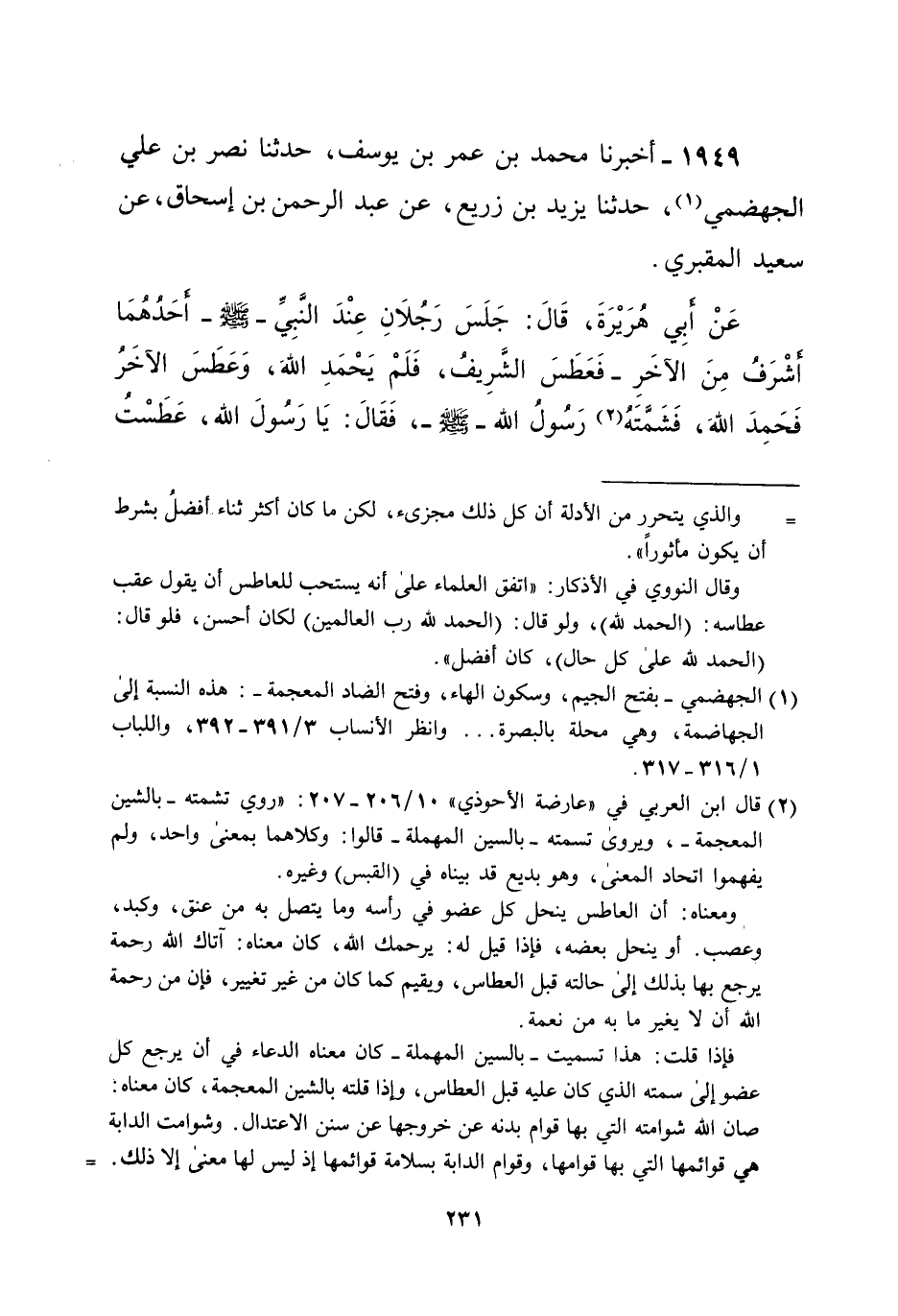 1949 - أخبرنا محمد بن عمر بن يوسف، حدثنا نصر بن علي الجهضمي (¬1)، حدثنا يزيد بن زريع، عن عبد الرحمن بن إسحاق، عن سعيد المقبري. عَنْ أَبِي هُرَيْرَةَ، قَالَ: جَلَسَ رَجُلانِ عِنْدَ النَّبِيّ -صلى الله عليه وسلم- أحدُهُمَا أَشْرَفُ مِنَ الآخَرِ- فَعَطَسَ الشَّرِيفُ، فَلَمْ يَحْمَدِ اللهَ، وَعَطَسَ الآخَرُ فَحَمِدَ اللهَ، فَشَمَّتَهُ (¬2) رَسُولُ الله -صلى الله عليه وسلم-، فَقَالَ: يَا رسول الله، عَطَسْتُ