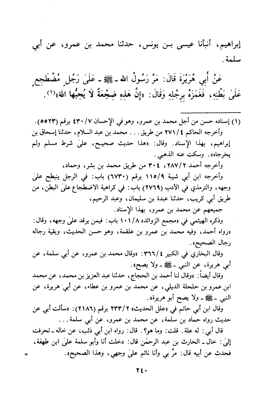 إبراهيم، أنبأنا عيسى بن يونس، حدثنا محمد بن عمرو، عن أبي سلمة. عَنْ أَبِي هُرَيْرَةَ قَالَ: مَرَّ رَسُولُ الله -صلى الله عليه وسلم- عَلَى رَجُلٍ مُضْطَجِعٍ عَلَى بَطْنِهِ، فَغَمَزَهُ بِرِجْلِهِ وَقَالَ: "إِنَّ هذِهِ ضِجْعَةٌ لا يحِبُّها اللهُ" (¬1).