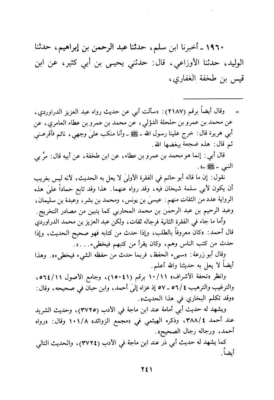 1960 - أخبرنا ابن سلم، حدثنا عبد الرحمن بن إبراهيم، حدثنا الوليد، حدثنا الأوزاعي، قال: حدثني يحيى بن أبي كثير، عن ابن قيس بن طخفة الغفاري،